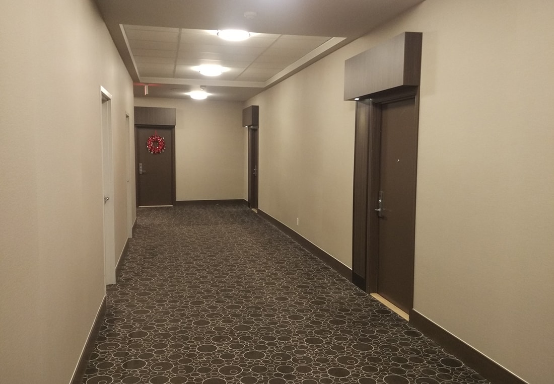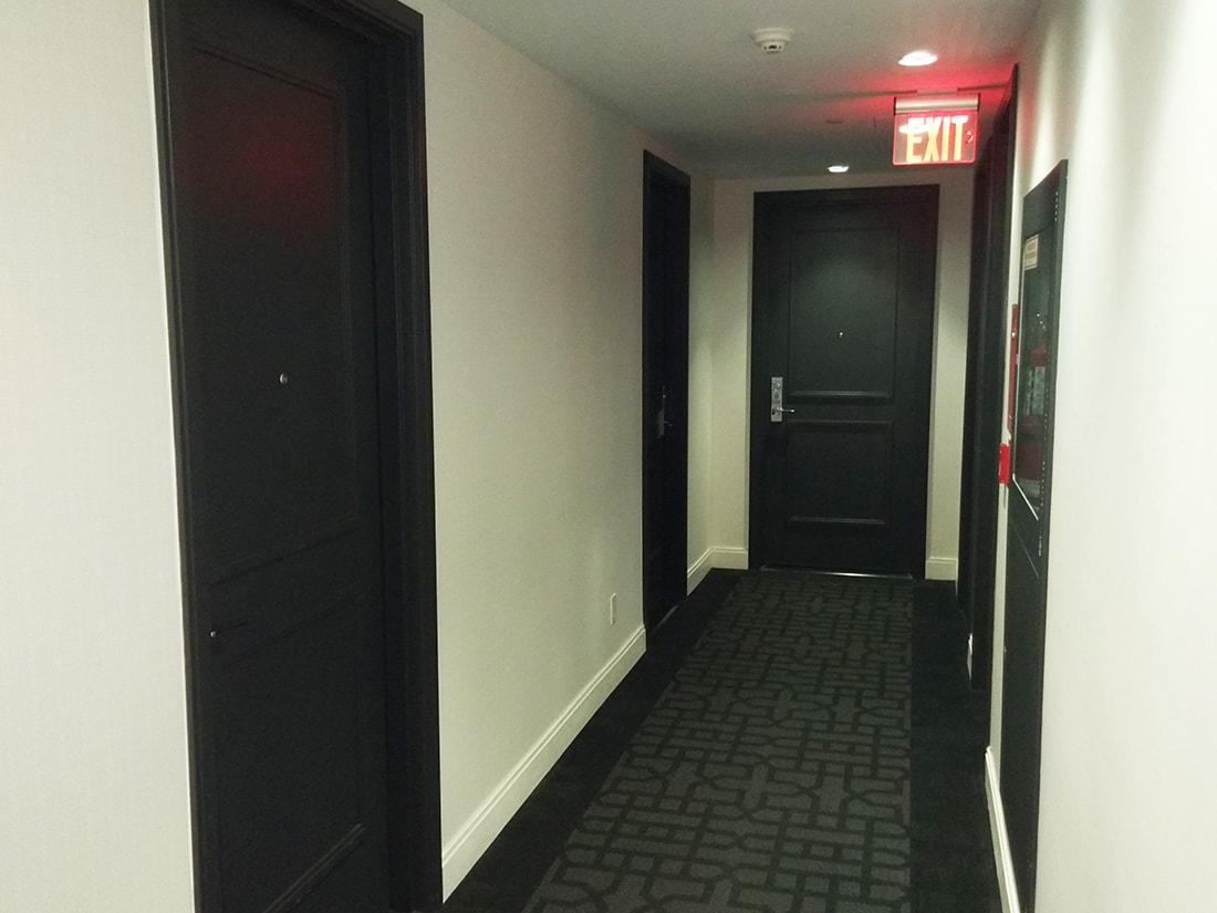 Что касается площадок для квартир, то тут все проще простого. Во всех домах только один подъезд/вход. Поэтому на этажах своего рода коридорная система: один длинный проход и по обе стороны от него двери квартир — штук 15—30. Жилые площадки в разных домах выглядят примерно одинаково — так, будто это коридор отеля. Кстати, коридор — это не частная собственность каждого жильца, так что отгораживать себе углы, менять двери (они изначально все одинаковые) жильцам нельзя.