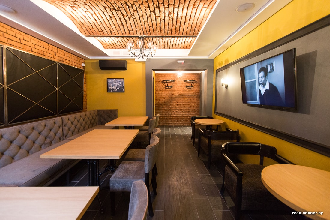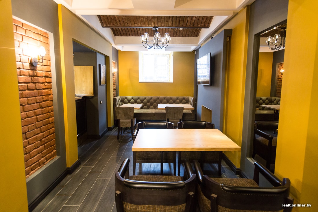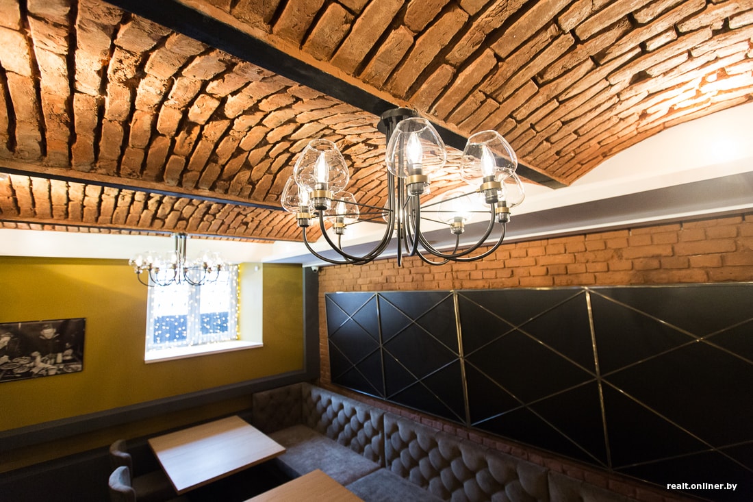 — Дом 1908 года, высота потолков — от 1,40 метра, поэтому, чтобы приспособить помещение под общепит, нужно было провести немало работ. В здании уникальные сводчатые потолки, которые не трогали при ремонте. Кирпичи — это не декор, а настоящие стены и потолки. Стены цвета охры придают уют и лоск.