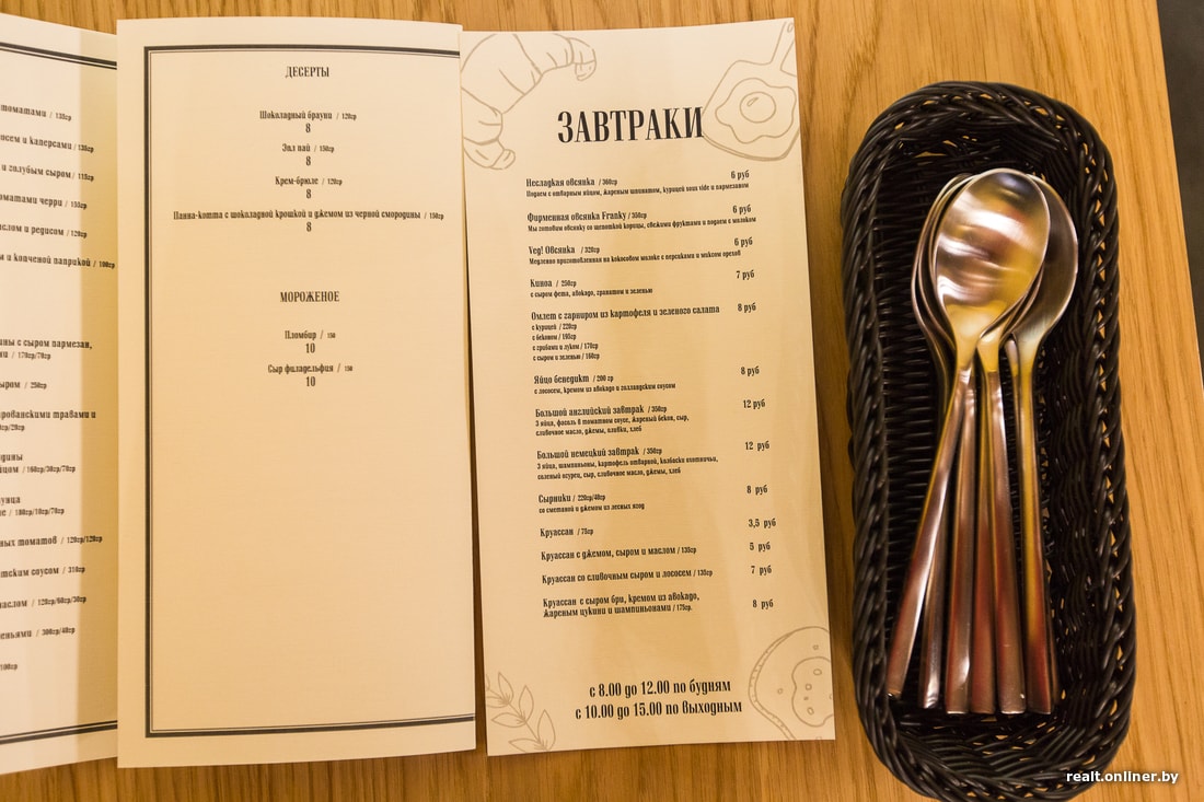 Кухня во Franky европейская, но меню будет дополнено блюдами и коктейлями из эпохи Фрэнка Синатры и нью-йоркских гангстеров. Есть меню завтраков.