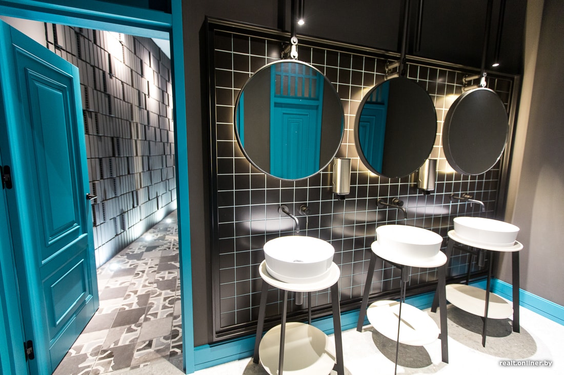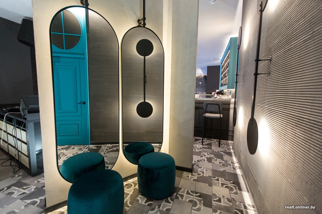 Интерьер сделан в современной классике с элементами лофта. Есть металлические люстры, кирпичные конструкции, но градус брутальности снижен мягкой мебелью, мраморными текстурами. Акцентным цветом выбрана бирюза, он приятный, навевает ассоциации с Tiffany, морской волной. Так как окна смотрят на реку, у нас была возможность поставить классные круглые столы. Вся мебель и элементы декора производились по чертежам под заказ.