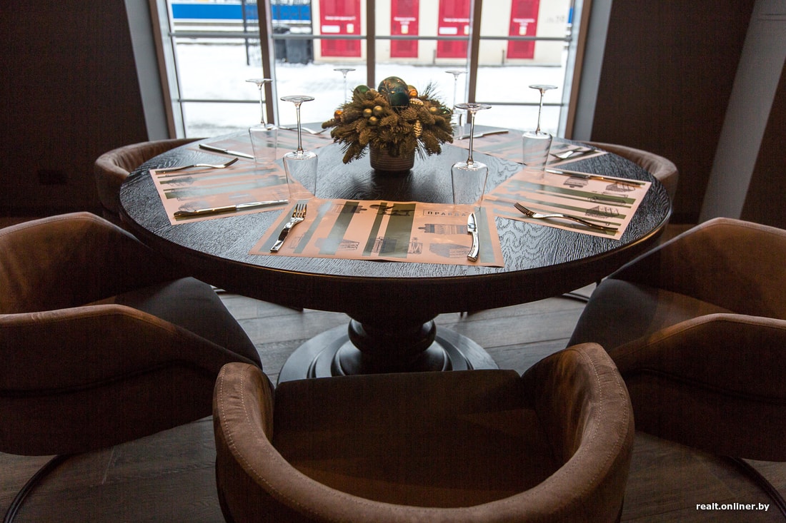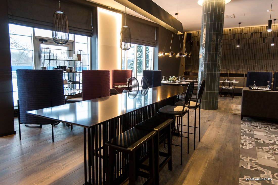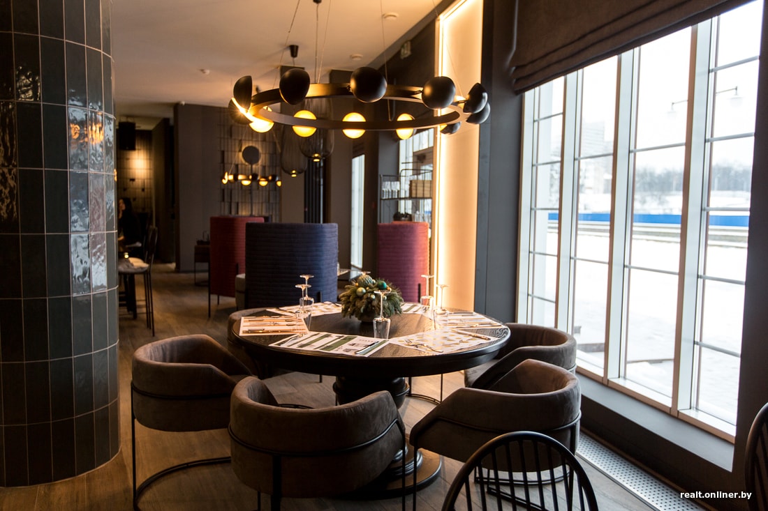 Интерьер привычный минчанам. Обращают на себя внимание кресла с высокой спинкой, за которыми можно спрятаться, ну и, конечно, панорамные окна с видом на Свислочь. В помещении 64 посадочных места.
