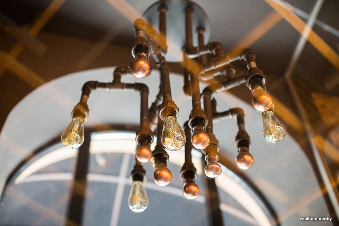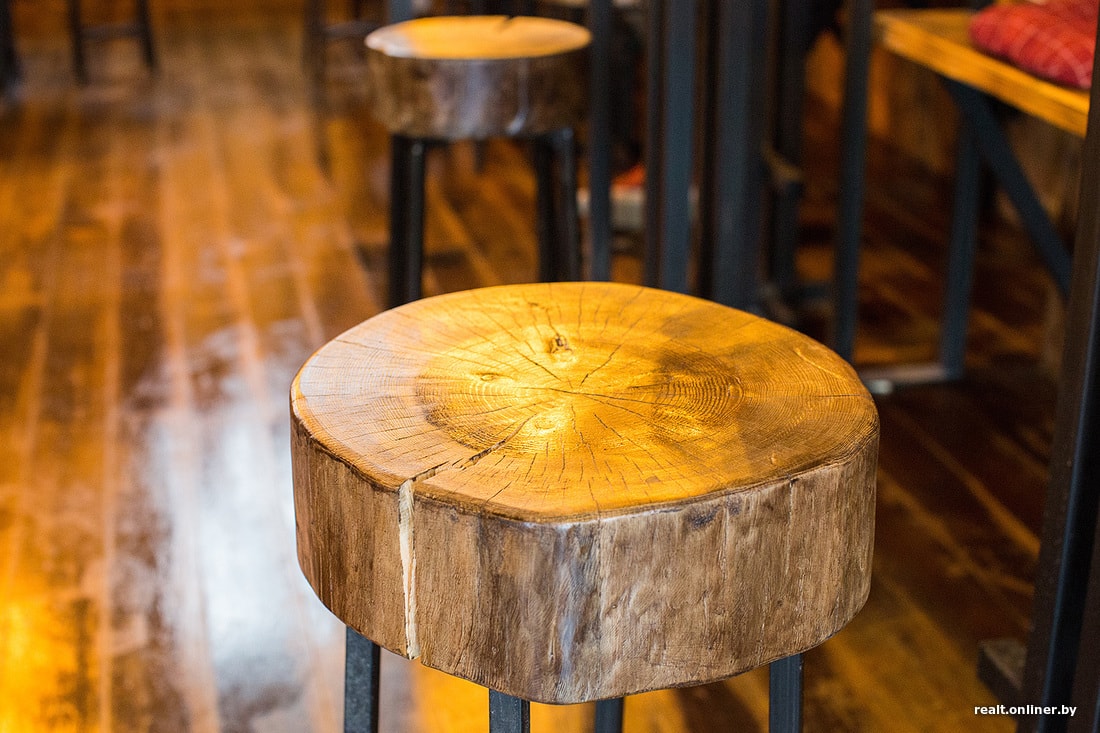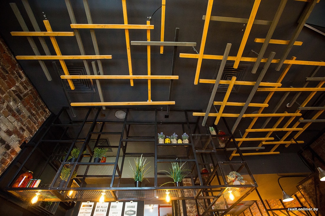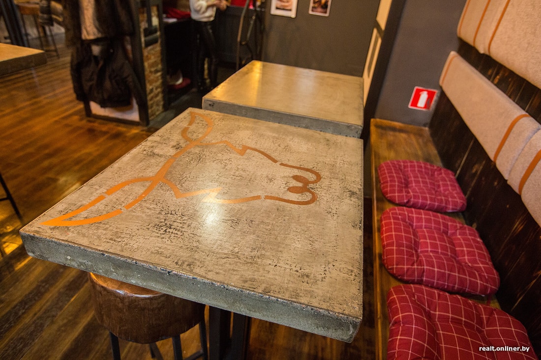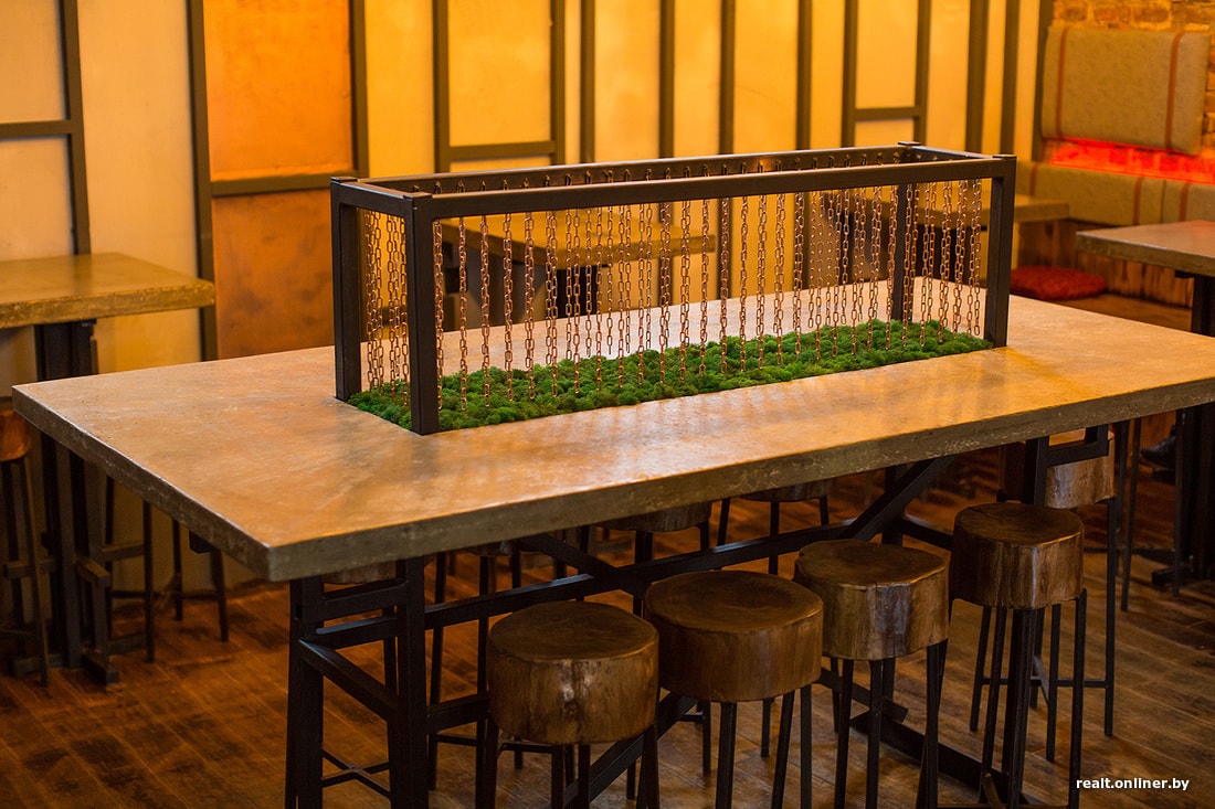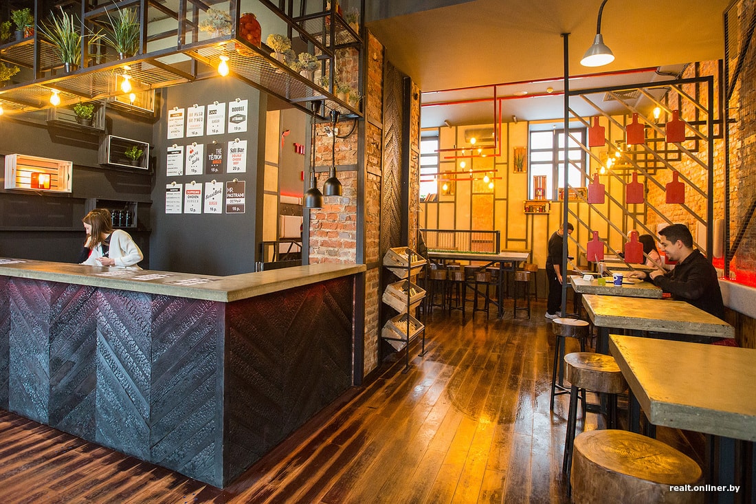 — Мы попытались здесь воплотить формат американской бургерной, — говорит Бирюков. — Во многих фильмах в таких местах есть большая барная стойка, за которой можно сделать заказ, есть элементы лофта, домашнего интерьера, зелень, кирпич. Думаю, получилось хорошо, эксклюзивно. Столы сделаны из наливного шлифованного бетона, зачищенного, залитого лаком — такого в Минске нет нигде. Стулья — из цельного дерева. Все сделано белорусскими мастерами вручную.
