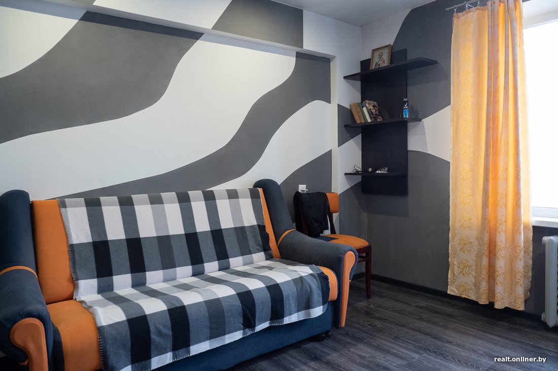 Эта комната находится в панельном доме 1971 года постройки. Интерьер строго придерживается трех цветов: серый, белый, оранжевый. Стены декорированы сложным орнаментом, который обыгрывает нишу за диваном.