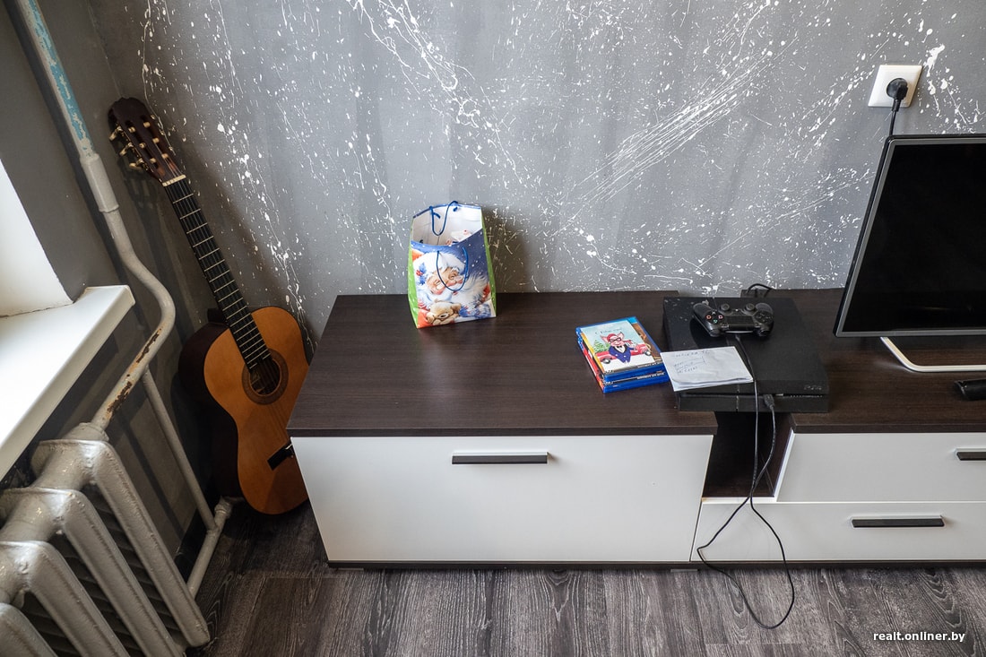 В комнате минимум улик. Здесь нет ничего, похожего на платяной шкаф. Есть тумба под телевизором и пара полок в углу, где хранятся 4 книжки, наушники и парфюм. Кроме них, в комнате есть диван, приставка, дорожная сумка, гитара, рюкзак и несколько дисков с играми.