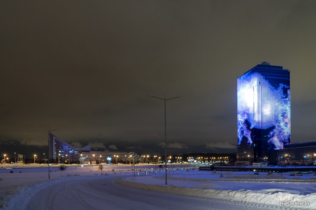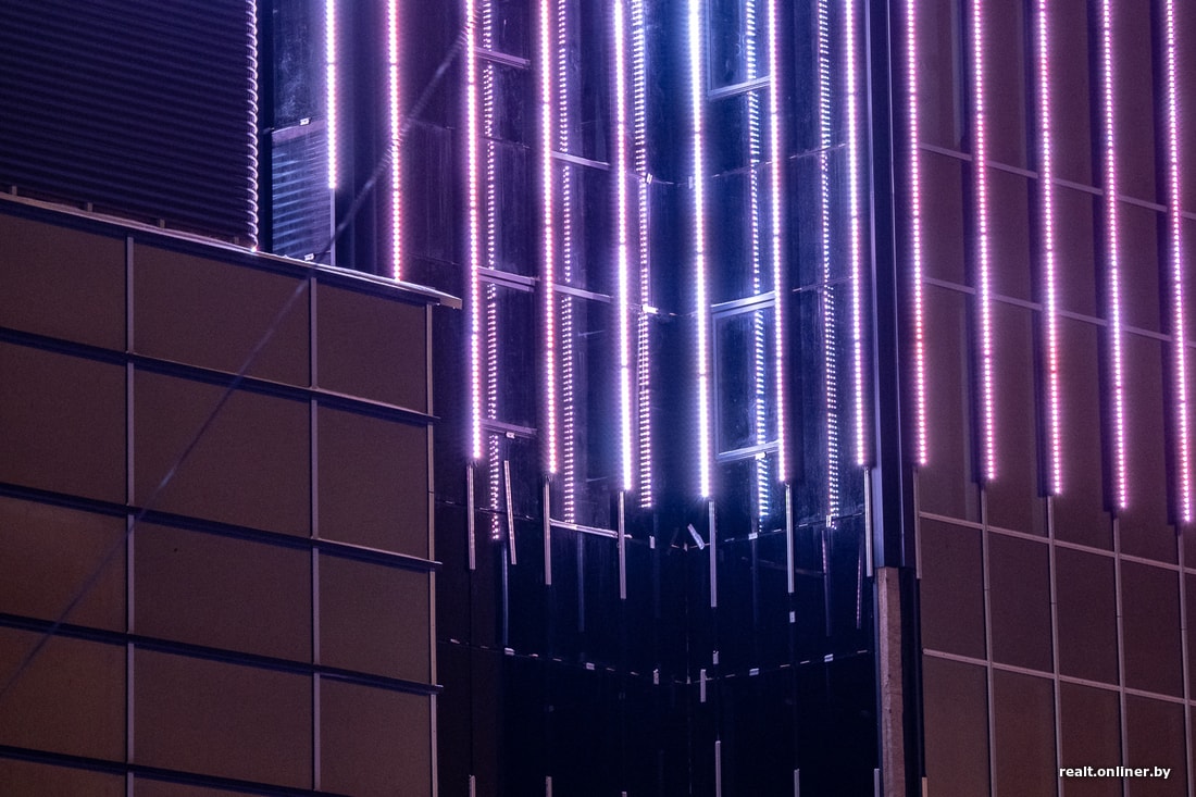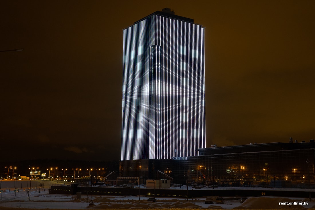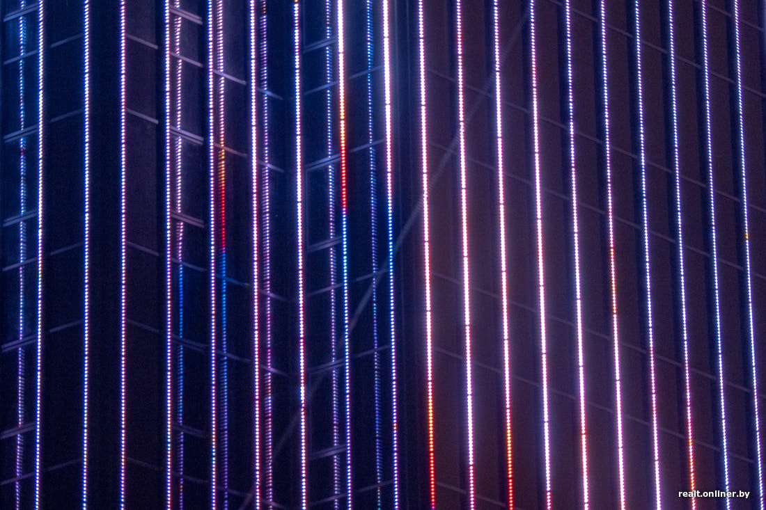 Мультимедийный фасад изготавливался на производстве в Китае, белорусы ездили туда и контролировали его изготовление. Именно там были созданы несколько образцов, которые впоследствии привезли сюда, сертифицировали и интегрировали в архитектурное решение здания.