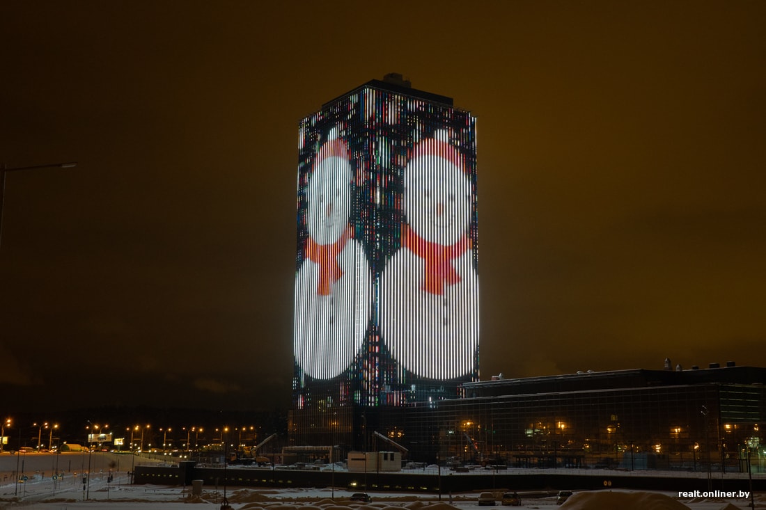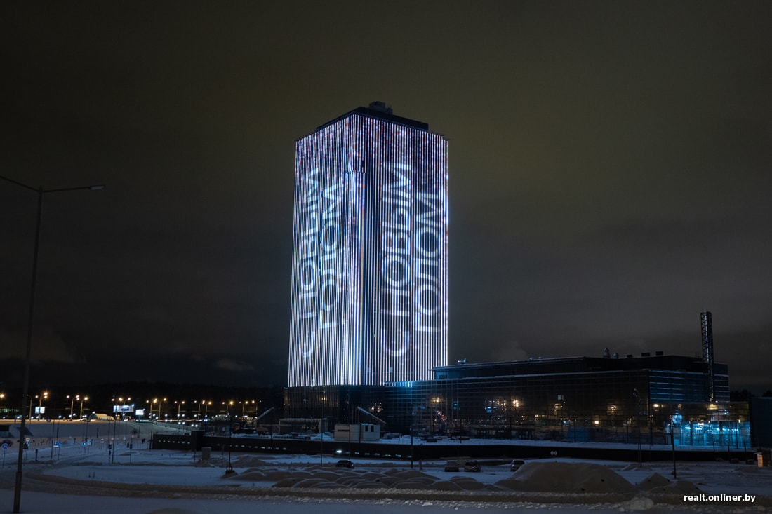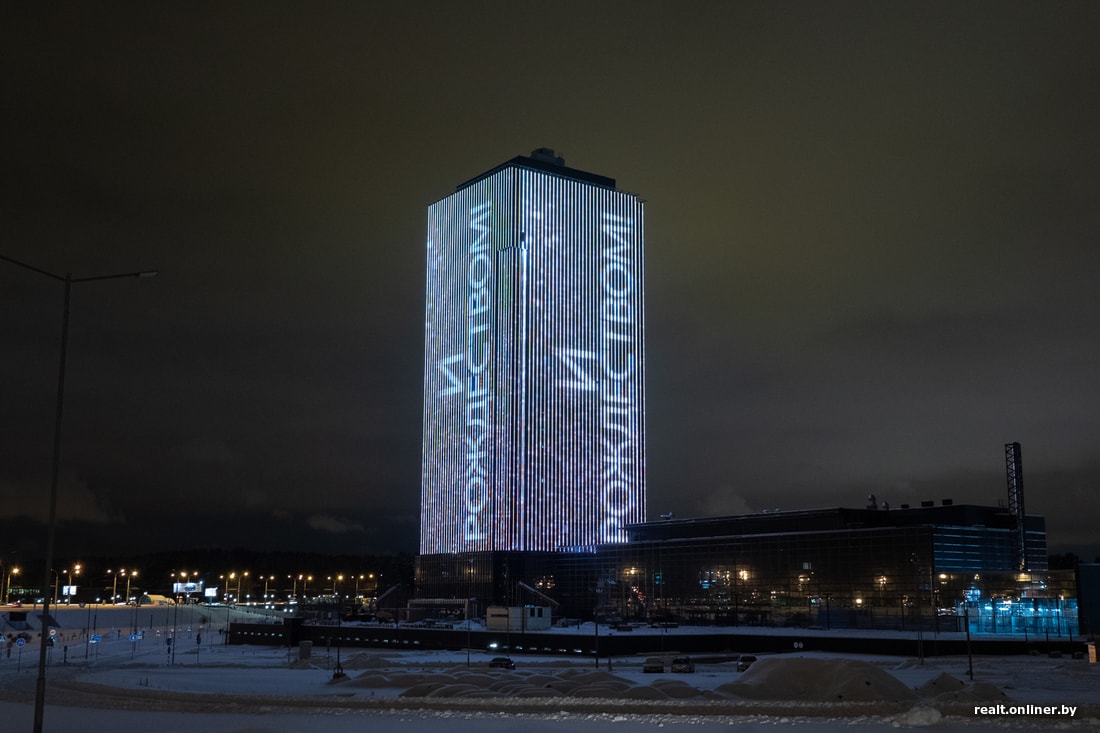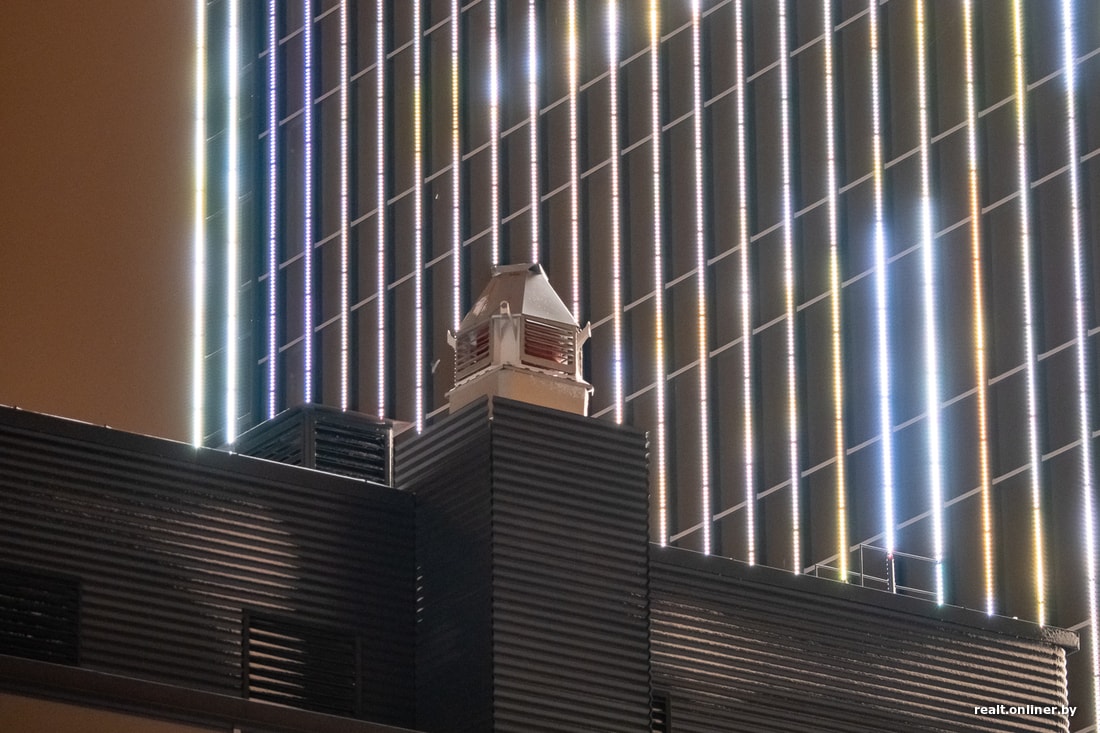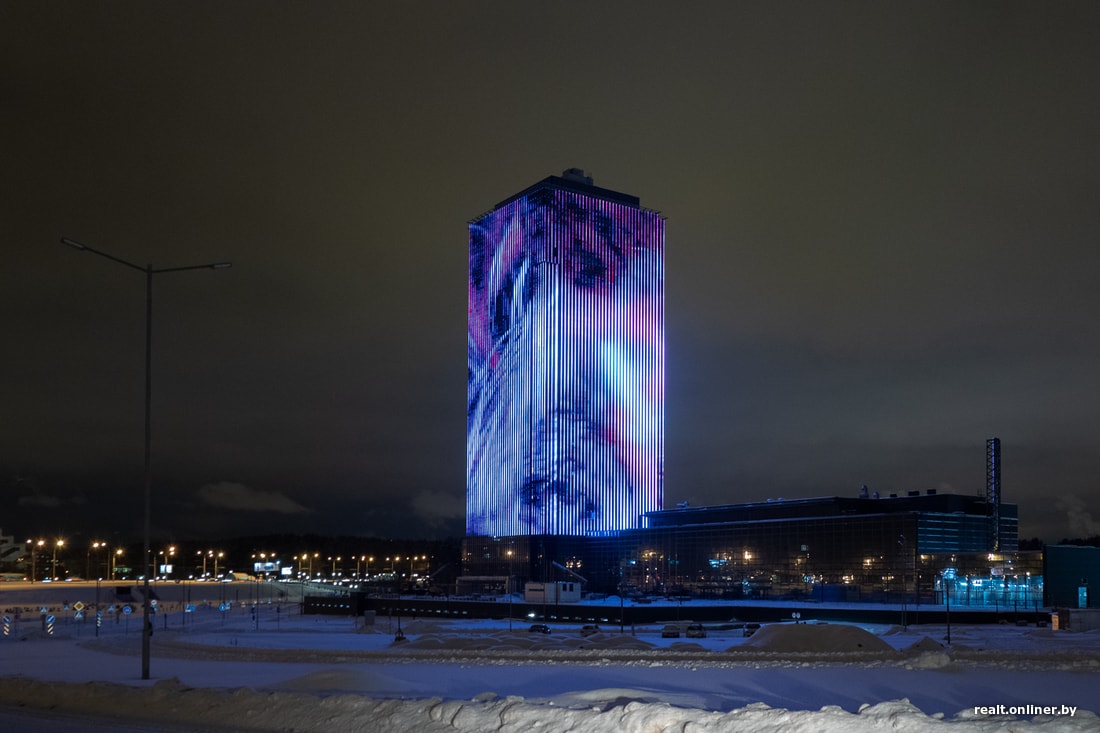 Мультимедийный фасад изготавливался на производстве в Китае, белорусы ездили туда и контролировали его изготовление. Именно там были созданы несколько образцов, которые впоследствии привезли сюда, сертифицировали и интегрировали в архитектурное решение здания.