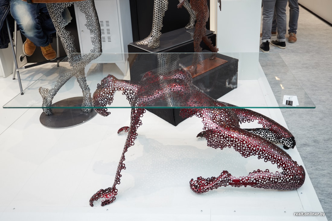 Новые способы окраски и обработки алюминия буквально заполонили выставку компактными столами, стилизованными под натуральный камень и мрамор: