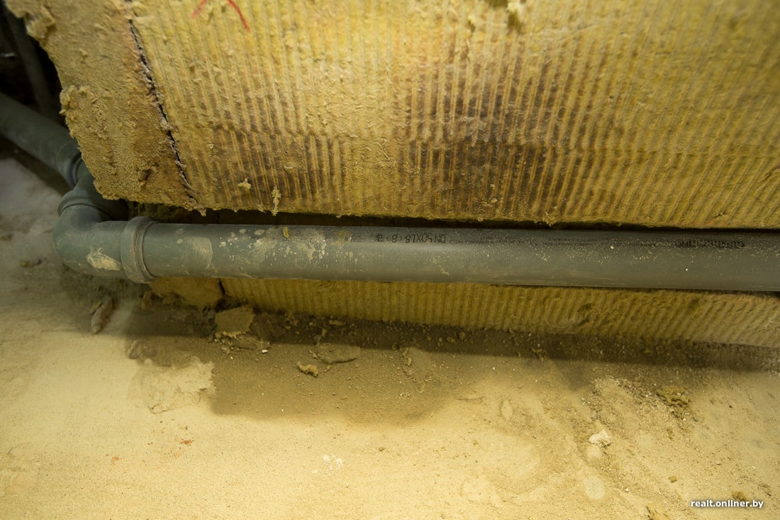 Пытаясь самостоятельно решить вопрос, Наталья с Валерием «обшили» «рыдающую» колонну утеплителем. Это не помогло — вода все так же бежит по стенам, правда, уже под слоем минваты. Следы ее можно видеть и сверху, и снизу.