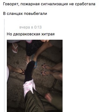 — Народ не очень быстро выходил на улицу, потому что сигнализация не сработала. Самое интересное, что за месяц, а потом ровно за неделю до пожара они проверяли «сигналку», которая на уши орала по два часа. Многие знакомые девочки говорили, что студенты из Туркменистана бегали по общежитию и кричали о пожаре, некоторые благодаря им и выбежали. Моя подруга, например, узнала о пожаре только по крикам на коридоре. А есть знакомая девочка, которая была в душе и вообще ничего не слышала, ее вообще пожарные вывели. Но спасатели молодцы, с момента крика «Вызывай!» и до прибытия 4—6 машин прошло не больше 5 минут. С отравлением увезли одного парня белоруса и двух иностранных студентов.