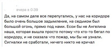 — Я была в коридоре одна (разговаривала по телефону), когда уже почувствовала легкий запах дыма со стороны балкона и мусоропровода. Как-то не пришло в голову, что это пожар. Я зашла в комнату, но не прошло и 5 минут, как и там невыносимо завоняло. Я вышла на коридор. Из мусоропровода шел черный дым, и я поняла, что нужно валить. Пока обувалась и набрасывала куртку, весь коридор был в черном густом дыму, он заволакивал потолок, и только на метр-полтора от пола была возможность пригнувшись выползти к лестнице. Все вышли из комнат посмотреть, что случилось. Народ не знал, откуда дым (все думали, что пожар в комнатах), у половины паника началась. Я одна из первых спустилась вниз, вместе со мной — только пара человек. На тот момент вахтеры только что узнали о пожаре и друг другу кричали «Вызывай!».