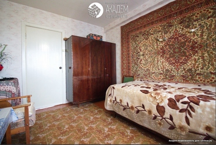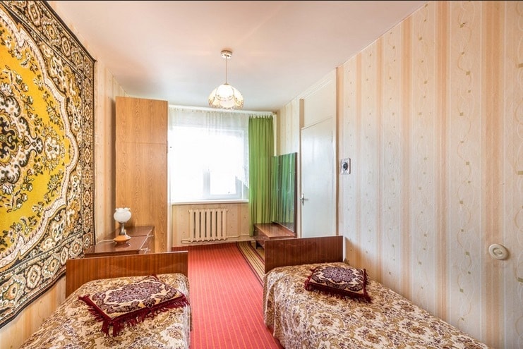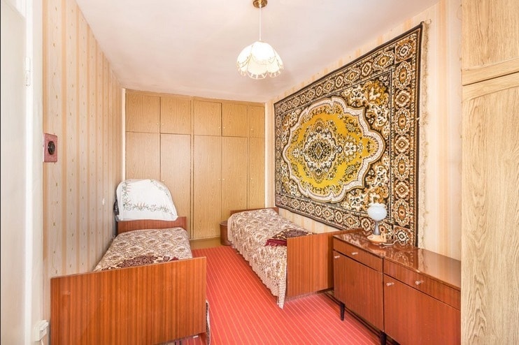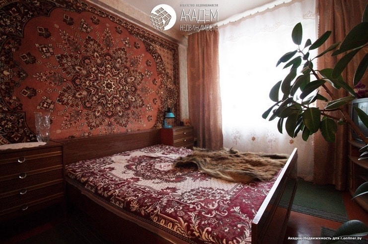 Что касается обстановки, то, помимо традиционных стенки, шкафов и лаковых кроватей, можно увидеть и трельяж, благодаря которому рассмотреть себя можно со всех сторон. Также в спальне представлена необычная расцветка ковра — горчично-коричневая: наверное, такая была редкостью, ведь большинство квартир довольствовалось красными и кофейными вариантами. «Квартира очень светлая и теплая. Планировка позволяет с использованием современных технологий создать интерьер своей мечты. Состояние квартиры позволяет первое время не думать о ремонте: установлены пластиковые стеклопакеты, экологически чистый деревянный пол, проведено оптоволокно. Балкон застеклен и подвергнут модернизации. Окна выходят на юго-восточную сторону во двор, очень чистый подъезд, спокойные и приятные соседи»,дополняет картину агент.