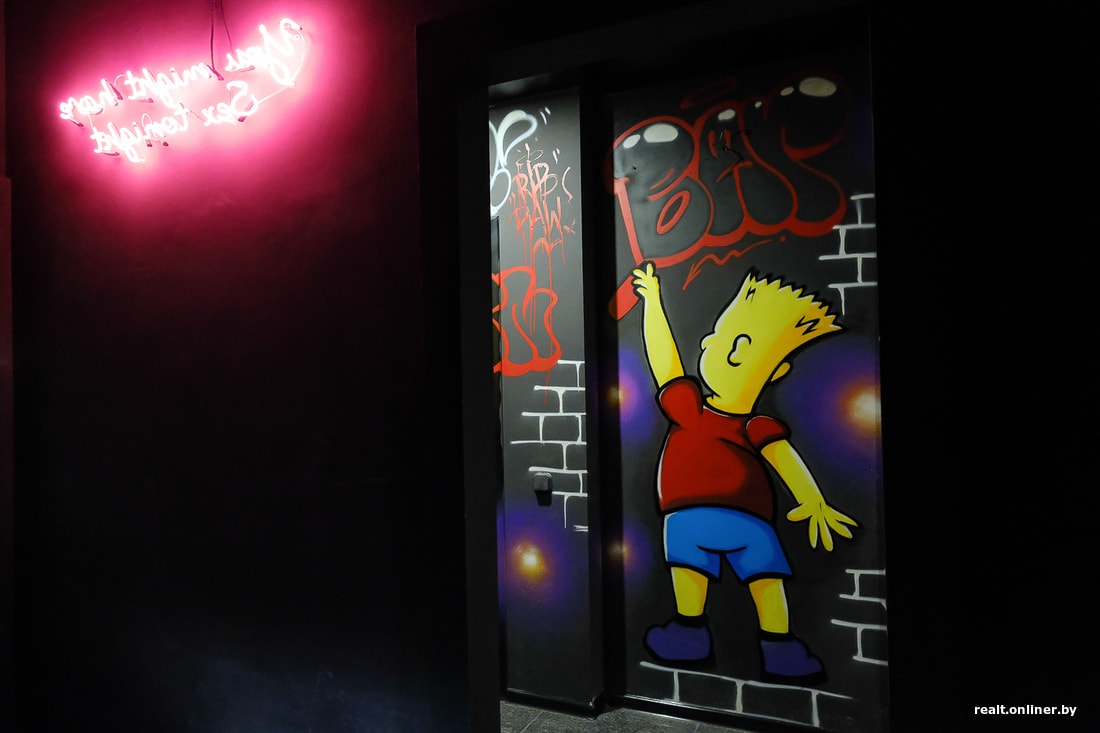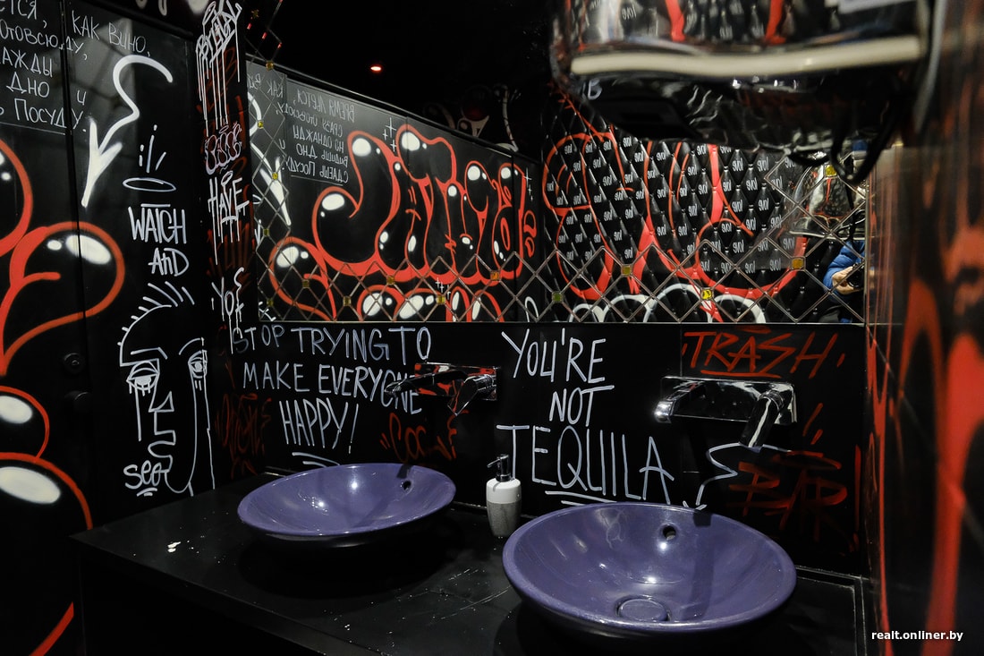 Стены в туалетах расписаны граффити — «Хотелось добавить немного треша в наш сдержанный интерьер», — улыбается управляющая.