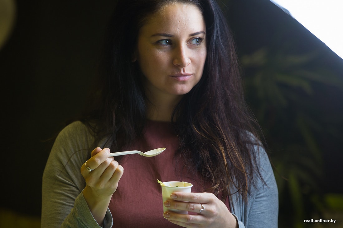 — Пришла поддержать веганское движение в нашей стране, потому что считаю, что братья наши меньшие должны жить и имеют такое же право на существование, как и люди, — рассказала Алена Onliner. — Я не знаю, как определить, вегетарианец я или нет, потому что я не ем мясо просто и люблю животных. Наверно, не будем вдаваться в тонкости. Мяса не ем уже год. Делала это не специально, просто в какой момент жизни стала практиковать очистки организма, которые заключались в том, что ты постоянно ешь овощи и фрукты в течение какого-то времени. Мне настолько понравилось это состояние, что просто-напросто не смогла вернуться к мясу. Это какая-то внутрення свобода и защищенность от негатива. Ведь мы, люди, живем благодаря энергетике, которая есть внутри нас. Зачастую, когда нам ее не хватает, а черпать мы ее не научились, появляется раздражительность, болезни. Как раз таки мясо — это продукт с отрицательной энергетикой, который у вас забирает силы на переваривание. Овощи и фрукты восстанавливают, а мертвая еда — наоборот.