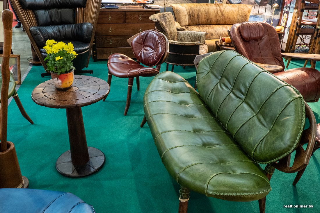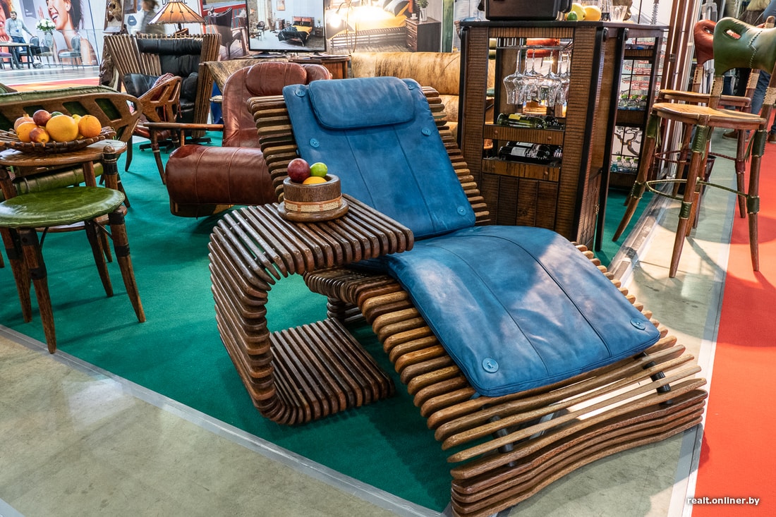 На выставке можно встретить образцы дизайнерской деревянной мебели.