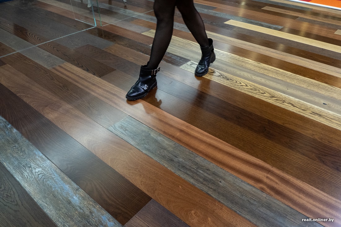 Павильоны «плиточников» хоть и велики, но занимают меньше половины выставки. Довольно масштабно на Batimat представлены и производители напольных покрытий. Из трендов в этой области можно отметить модульный паркет (одинаковые квадраты с геометрическим узором), состаренные поверхности, а также индивидуальные решения в укладке покрытий. Дизайнеры приветствуют комбинации элементов, различных по цвету, ширине и длине, а также плавные переходы от светлых тонов к темным. Такие приемы позволяют зонировать пространство, сделать напольное покрытие активной частью интерьера.