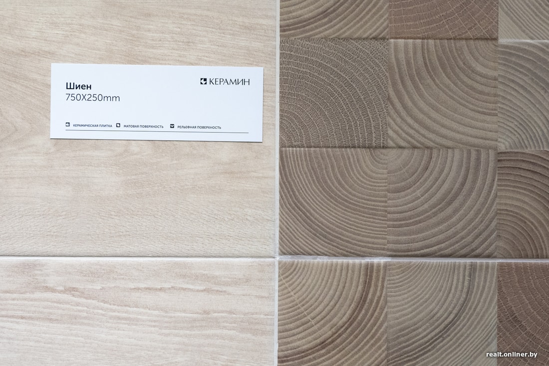 А вот «керамическое дерево» от «Керамина» — коллекция 2019 года под названием «Шиен». Фактура древесины различных пород дополнена декоративным рисунком, напоминающим спилы стволов с годичными кольцами. Выглядит вполне естественно.