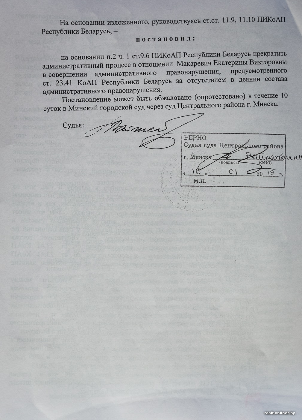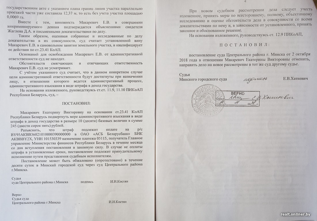 Но в Комитете землеустройства, по всей видимости, так не считают: прошло немного времени, и девушка получила повестку в суд. Пока тяжбы идут с переменным успехом: минчанка то проигрывает, то выигрывает дело о самозахвате. Всего прошло уже шесть заседаний и вынесено пять постановлений. Последнее заседание, которое состоялось 20 марта 2019 года, было в ее пользу: вина не доказана. Но Екатерина понимает, что вряд ли на этом дело закончится. И вероятность штрафа в 10 базовых и предписания снести ворота все также реальна.