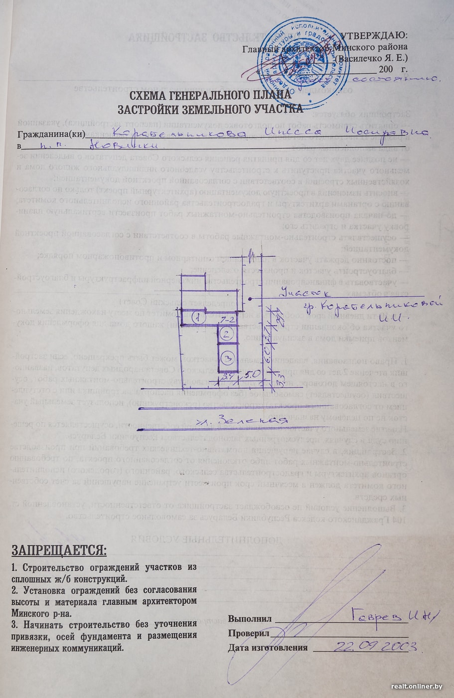 — Понятно же, что разрешение на строительство и реконструкцию выдается, только если твой проект соответствует всем существующим нормативам, — рассуждает Инесса. — Вот я вам покажу: тот же самый Цнянский сельсовет, который в июле отрезает кусок, в сентябре утверждает мне схему генерального плана застройки участка, в которой указывает, что расстояние от стены моих пристроенных помещений до забора составляет 5 метров. И эти метры не разделены на частные и государственные, все единое. Хотя, если уж вы внесли изменения и урезали мои границы, должны были бы показать другие цифры?