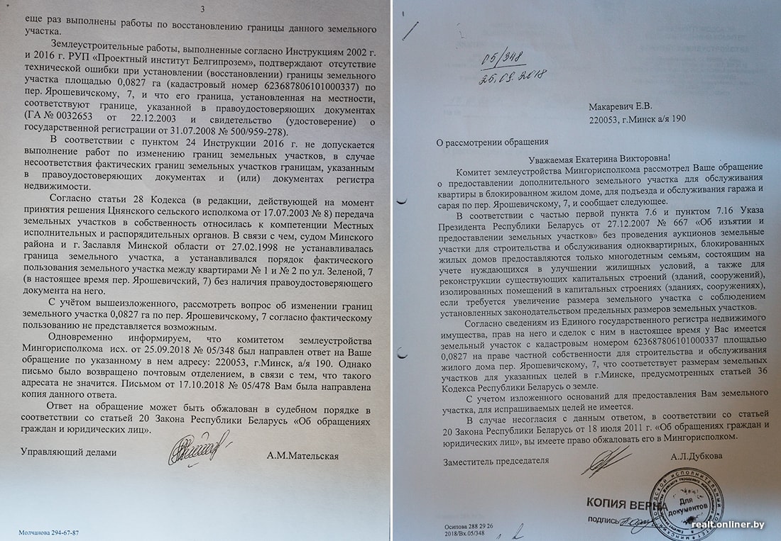 Тогда я решила отправить письменное обращение с просьбой объяснить, как можно легализовать эту землю и продолжить ей пользоваться. Ответа долго не было. В итоге вместо разъяснений я получила повестку в Комитет землеустройства Мингорисполкома. Когда пришла, на меня составили протокол об административном правонарушении, согласно которому меня обвинили в самозахвате земли, а дальше собирались судить и штрафовать. А вот ответ, который, впрочем, содержал одни отказы, я получила только после того, как пожаловалась на то, что все предусмотренные законом сроки вышли.