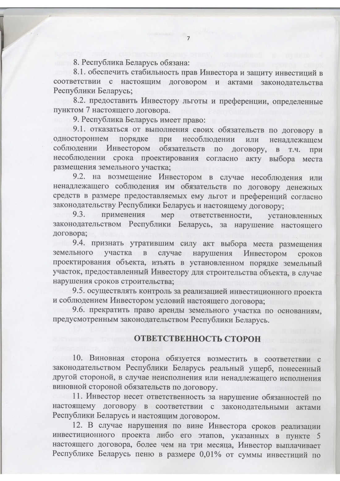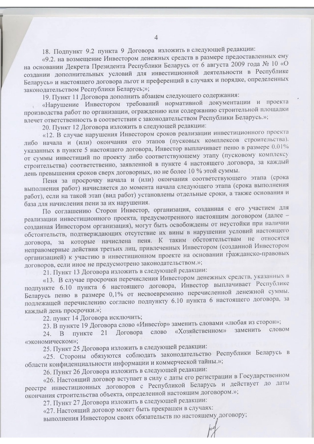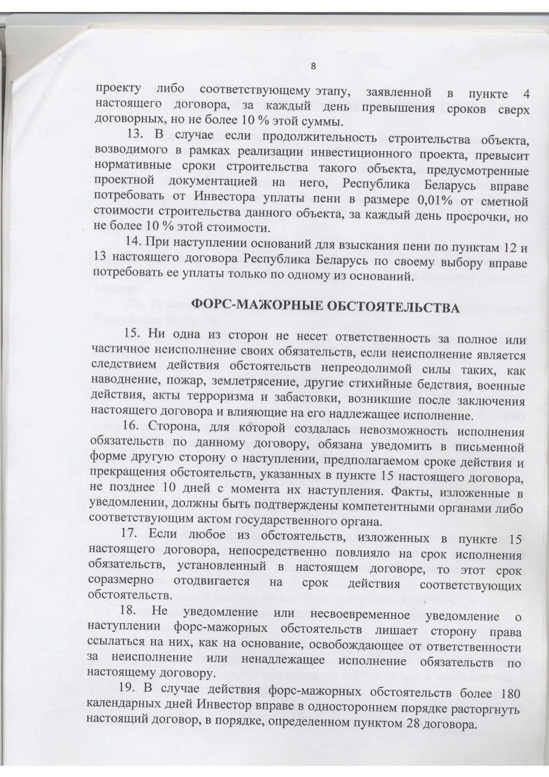 А для пущей надежности была сделана «амнистирующая» приписка: «После прекращения инвестиционного договора все обязательства сторон по инвестиционному договору, а также требования, вытекающие из инвестиционного договора, прекращаются, если иное не установлено законодательством Республики Беларусь». Таким образом, инвестор вышел из строительной переделки практически без потерь. Уникальный случай.