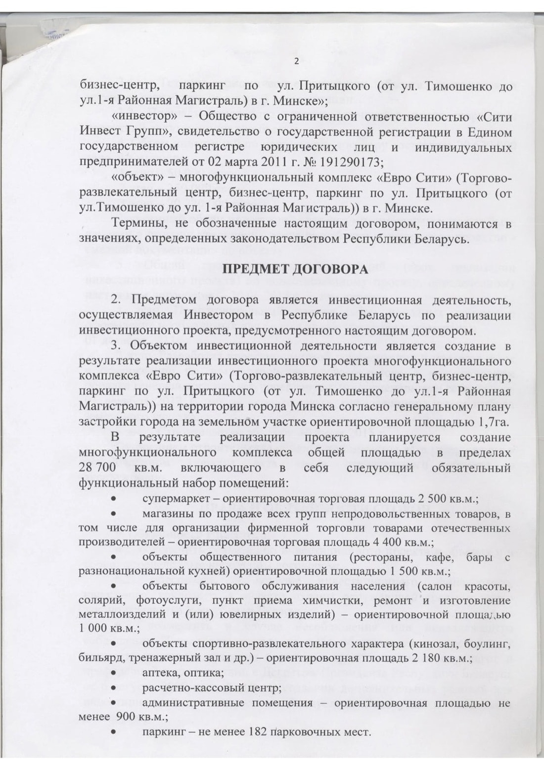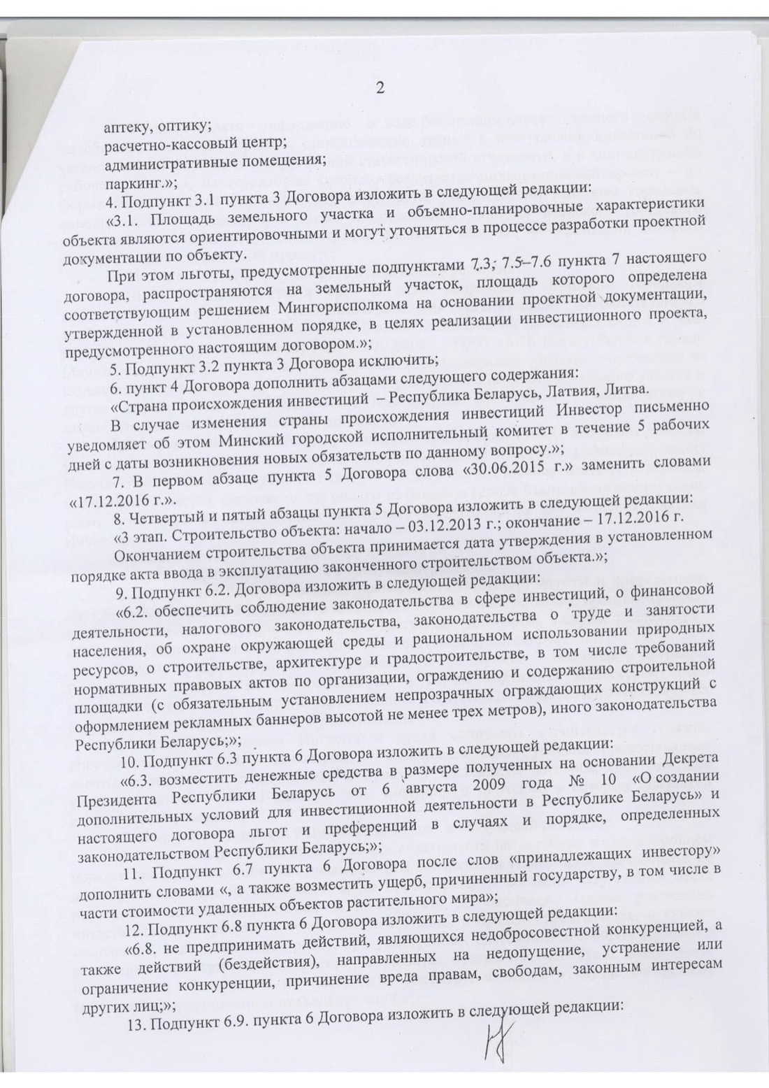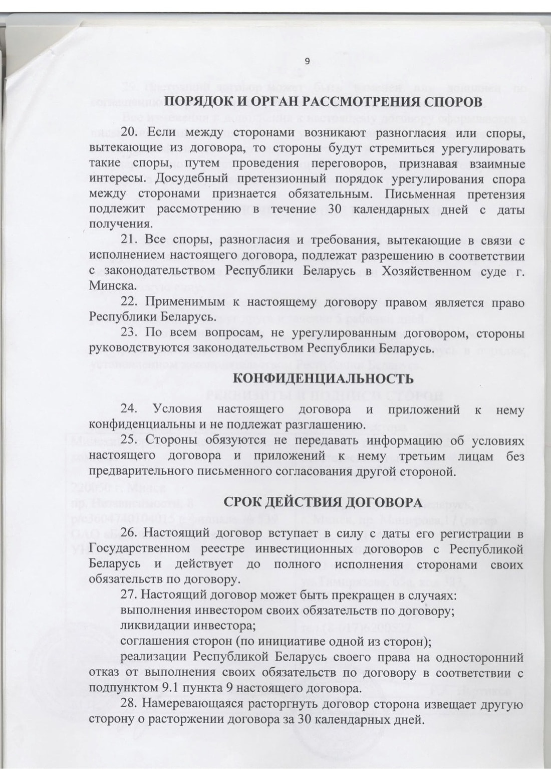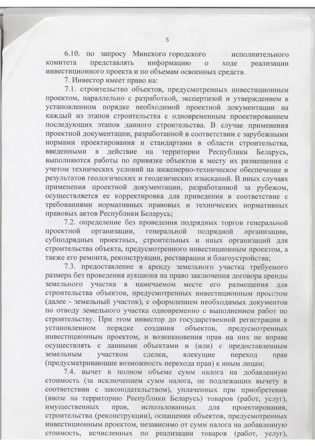 А для пущей надежности была сделана «амнистирующая» приписка: «После прекращения инвестиционного договора все обязательства сторон по инвестиционному договору, а также требования, вытекающие из инвестиционного договора, прекращаются, если иное не установлено законодательством Республики Беларусь». Таким образом, инвестор вышел из строительной переделки практически без потерь. Уникальный случай.