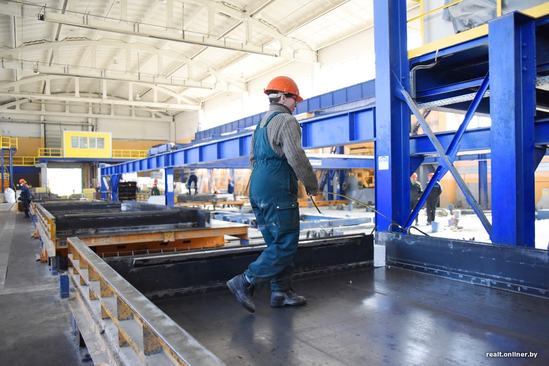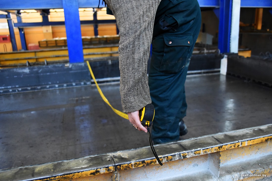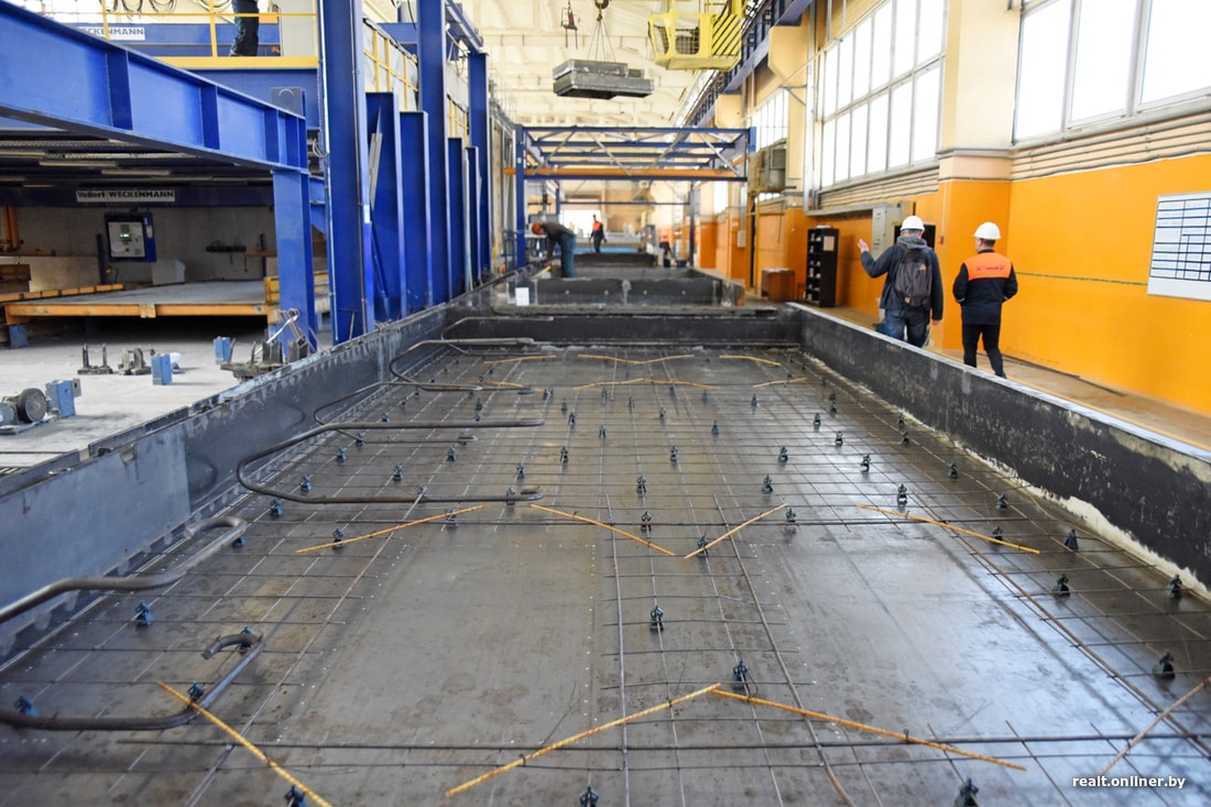 Вместе с главным инженером Гомельского завода крупнопанельного домостроения (он входит в структуру ДСК) Анатолием Пусенковым проходим по этапам технологической цепочки. Стеновые панели — трехслойные с теплоизоляцией, плиты перекрытия — однослойные. Смотрим, как делают стену.