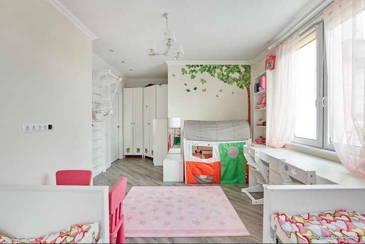 Следующий готовый к проживанию вариант — 93-метровая «трешка» по уже знакомому адресу Кирилла Туровского, 22 (дом «Кандинский»). На этот раз мы заберемся не так высоко — на уровень восьмого этажа. Здесь нас ждет светлая квартира в современном стиле с симпатичной детской комнатой, явно сделанной с большой любовью для двух дочерей.