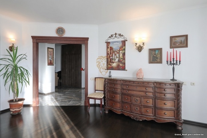 Видно, что жилье ремонтировали с любовью, получилось что-то в духе загородного особняка, где любят массивную мебель из натурального дерева и большие свободные пространства. Общую территорию разделили на четыре жилые комнаты (хотя можно было бы и больше), самая большая из них имеет площадь 37 квадратных метров, а самая маленькая — 10,4. Большой квартире — просторные санузлы по 9 и 6 «квадратов». Гардеробные не запроектированы, но шкафов в квартире столько, что хозяева явно не испытывают проблем с тем, чтобы наводить порядок и размещать по полочкам все вещи.