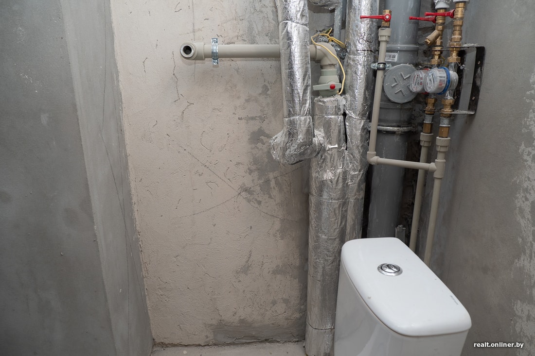 Стена, которая отделяет санузел от кухонной зоны, утеплена минватой (скорее всего) и зашита гипсокартоном. Нечто подобное мы наблюдали в новостройках в Новинках. Почему в одних домах делается именно так, а в других — по старинке, без «выкрутасов», никто не ответит. Во всяком случае у будущего жильца есть выбор: оставить минвату как дополнительную шумоизоляцию, но использовать для навешивания верхних кухонных шкафчиков нестандартные, мощные, дюбеля-анкера — или убрать минвату с гипсокартоном, высвободив до 10 сантиметров пространства вдоль перегородки.