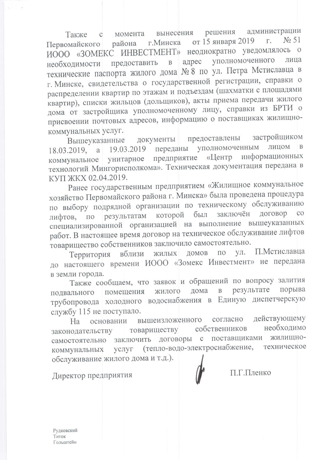 Жилой дом введен в эксплуатацию (акт приемки от 28.12.2018) с установленными согласно проекту и работающими лифтами, что было подтверждено соответствующими испытаниями, полученным заключением Госпромнадзора, других надзорных органов, а также членами приемочной комиссии. Дом в феврале 2019 года с участием генерального подрядчика, заказчика, инжиниринговой организации, представителя ЖКХ Первомайского района г. Минска передан в установленном порядке КУП «ЖКХ Первомайского района г. Минска» для эксплуатации с оформлением соответствующего акта. Застройщик с момента передачи дома ЖКХ не распоряжался работой лифтов. В апреле 2019 года для управления общим имуществом жилого дома создано товарищество собственников. В связи с этим все вопросы, касающиеся эксплуатации лифтов, их включения и выключения, режима работы и т. д., входят исключительно в компетенцию эксплуатирующей и управляющей общим имуществом жилого дома организации.