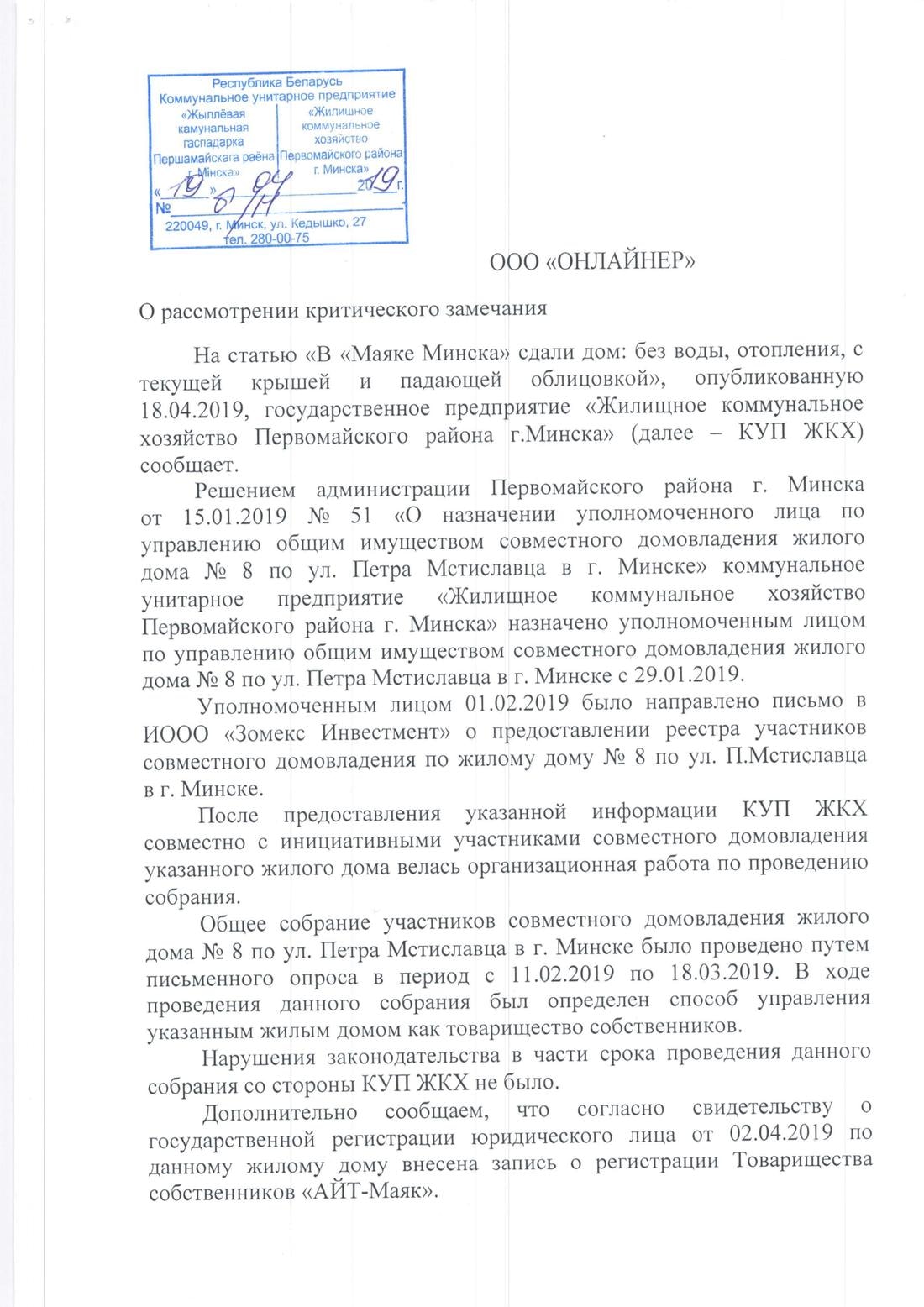 У нас не было контактов жильцов, чтобы организовать собрание и принять решение о создании товарищества. Дом пустой, в нем никто не живет, нельзя просто взять и пройтись по квартирам. Мы просили КУП «ЖКХ» устроить собрание жильцов, отправили письмо в «Зомекс», но никто не помог нам его организовать.