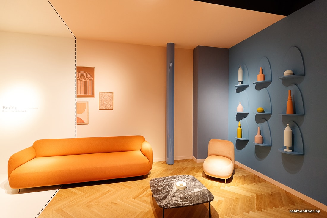Никуда не деться от ковров: из них делают композиции, кладут на пол и вешают на стены. Таких стендов по выставке наберется не меньше десятка. Обычно там разыгрываются известные геометрические формы, близкие цвета и нейтральные текстуры.