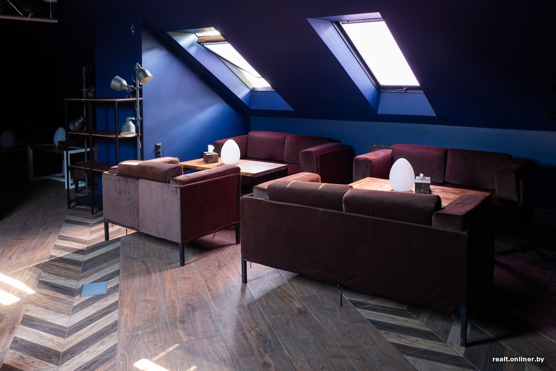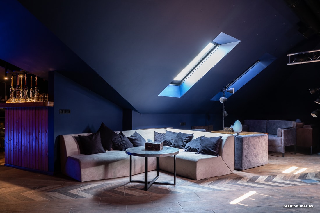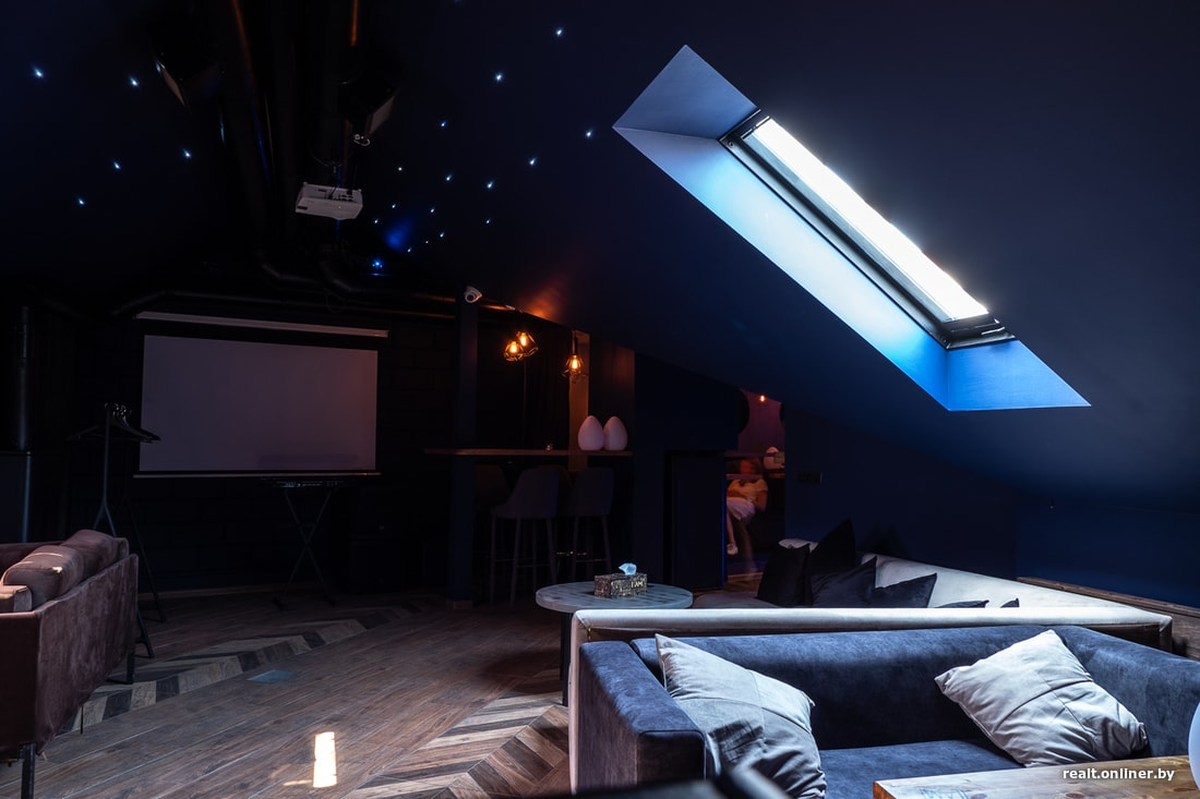 В помещении нет яркого света: точечные светильники аккуратно разбавляют густую уютную темноту. При этом есть возможность по ночам через мансардные окна смотреть на настоящие звезды.