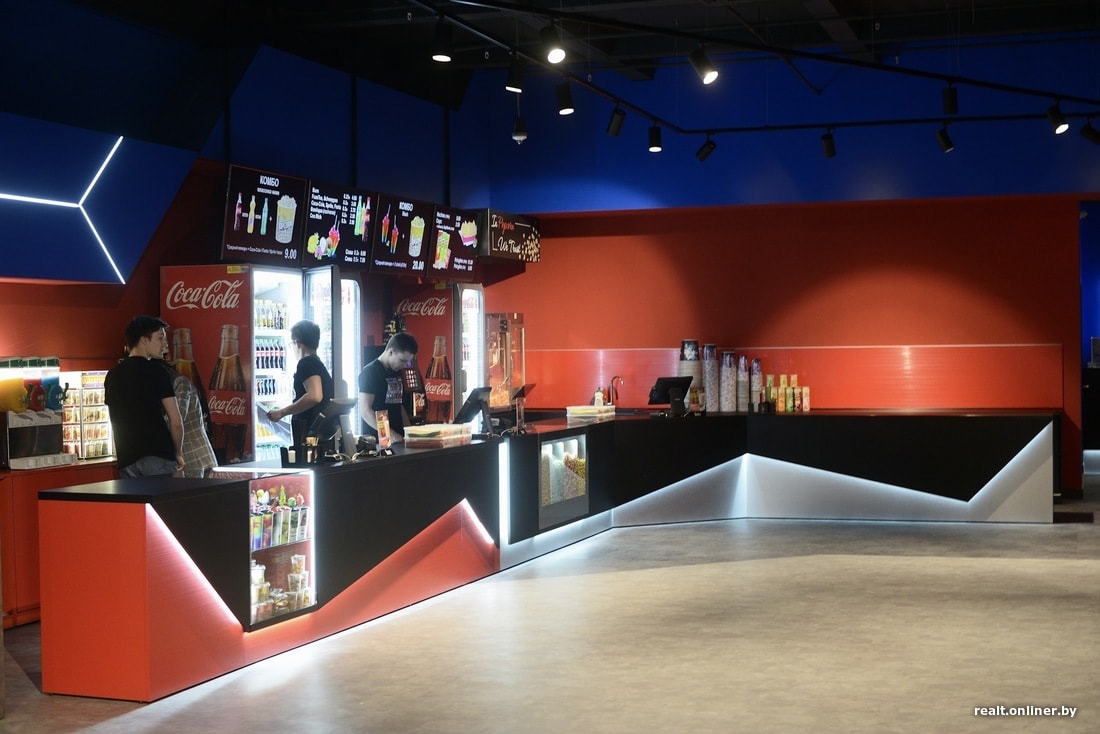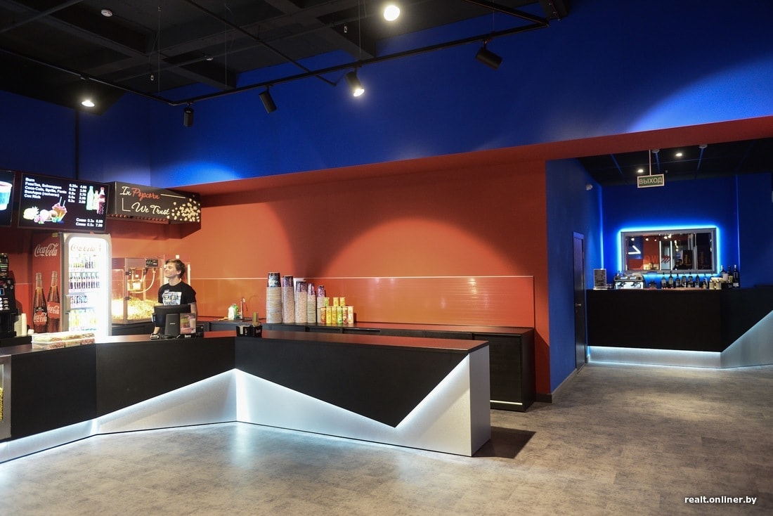 В холле кинотеатра реализована большая лаунж-зона, а также располагаются два бара: кинобар с широким выбором киноеды и уютный бар с разнообразными закусками и напитками.