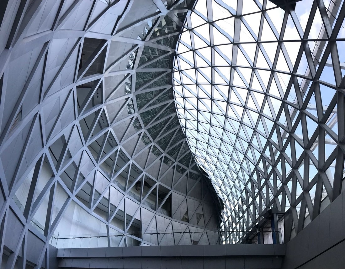 Сетчатую оболочку постройки поддерживают 14 древообразных опор. Остекление пропускает солнечный свет (необходимый для растений внутри) и одновременно защищает интерьер от излишнего жара и шума. Проектировщики также позаботились, чтобы блеск фасадов не мешал пилотам и диспетчерам.