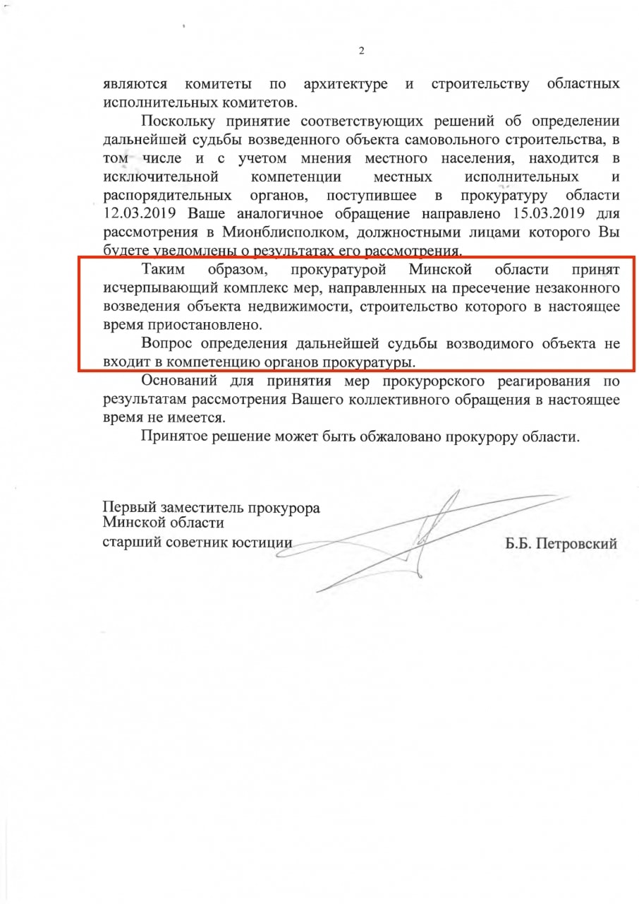Инициативная группа жителей Копища тоже направила коллективное обращение в Администрацию президента, Госконтроль, прокуратуру и облисполком: по мнению людей, возобновление стройки «будет противоречить основным принципам законности, равенства граждан перед законом, будет стимулировать к дальнейшему нарушению законодательства в строительной и других отраслях». Петицию за снос самостроя подписали 445 человек. Они получили официальный ответ от прокуратуры Минской области с очень непростой формулировкой, суть которой состоит в следующем: дом признали самостроем, но общественность и покупатели квартир обжаловали это решение. Дальнейшую судьбу стройки должны решать исполнительные и распорядительные органы.