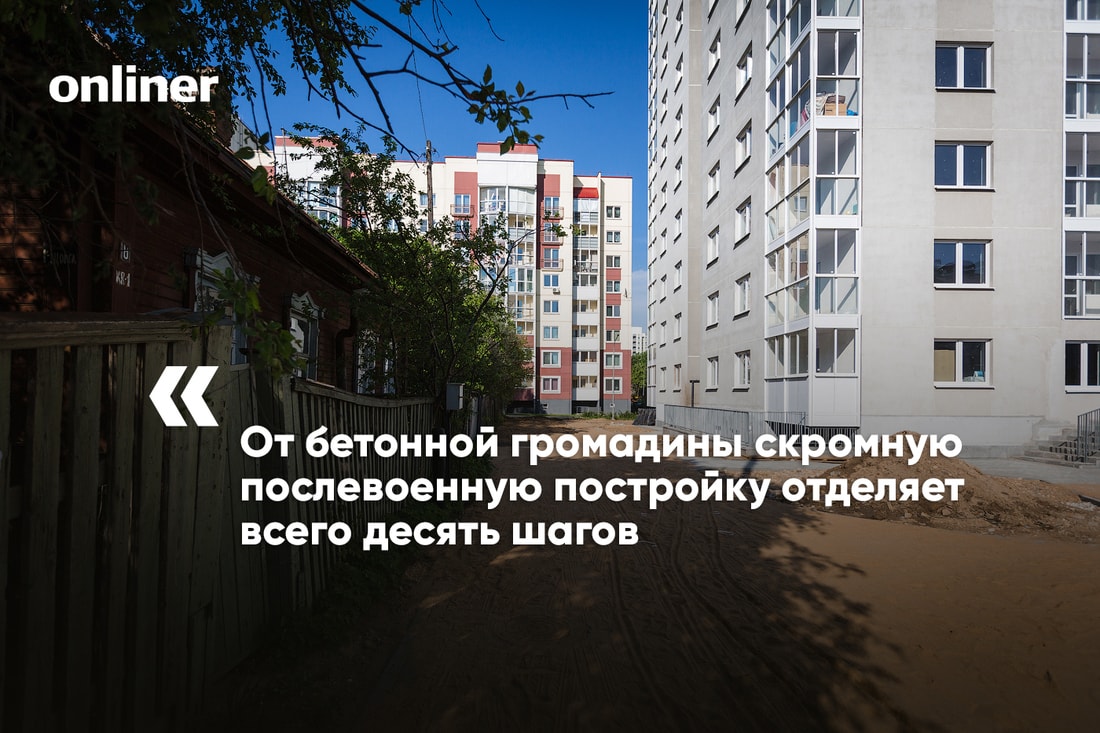 Однажды старенькие деревянные дома, как пригоршня гороха рассыпанные по городу, навсегда попрощаются с Минском и освободят место для чего-то нового. Хотелось бы того или нет — сценарий пишут другие люди. Если градостроительная политика не изменится, бетонные гиганты будут и дальше наступать на ряды малоэтажных сопротивленцев и выдавливать их с насиженных мест. И пока этот процесс не закончен, тяжело приходится обеим сторонам. В нашей сегодняшней истории конфликт интересов большого города и маленького человека получился очень наглядным: стоит только посмотреть со стороны.
