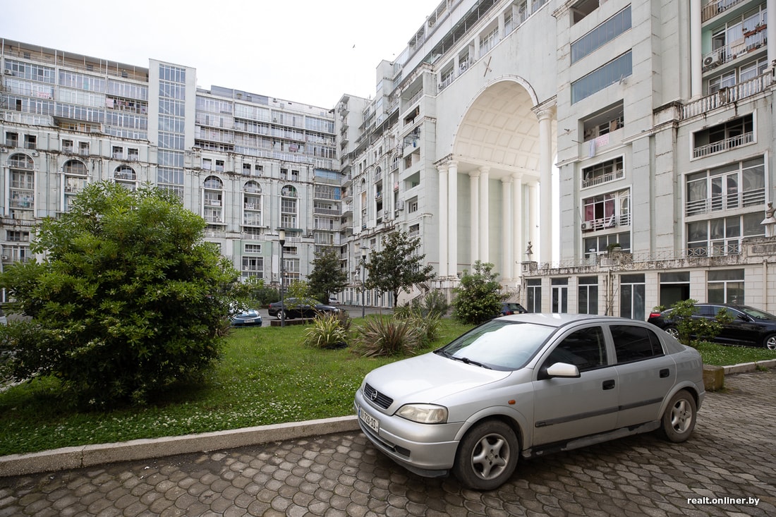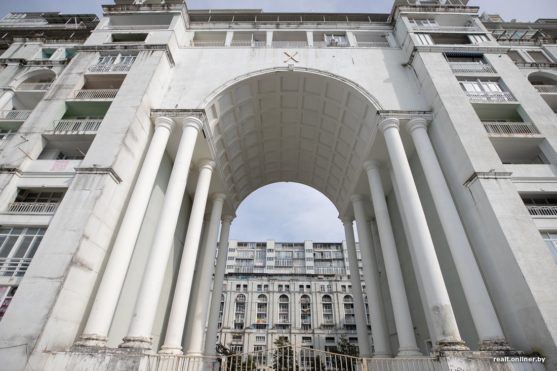 Перед вами жилой комплекс «Белая магнолия». Когда гуляешь по набережной Батуми, на такой дом невозможно не обратить внимание. Среди аккуратного бульвара, английского газона и модных высоток он выделяется своей вычурной монументальностью, неаккуратным видом и гигантской аркой, в которую могла бы, не склоняя головы, пройти типовая 10-этажка.
