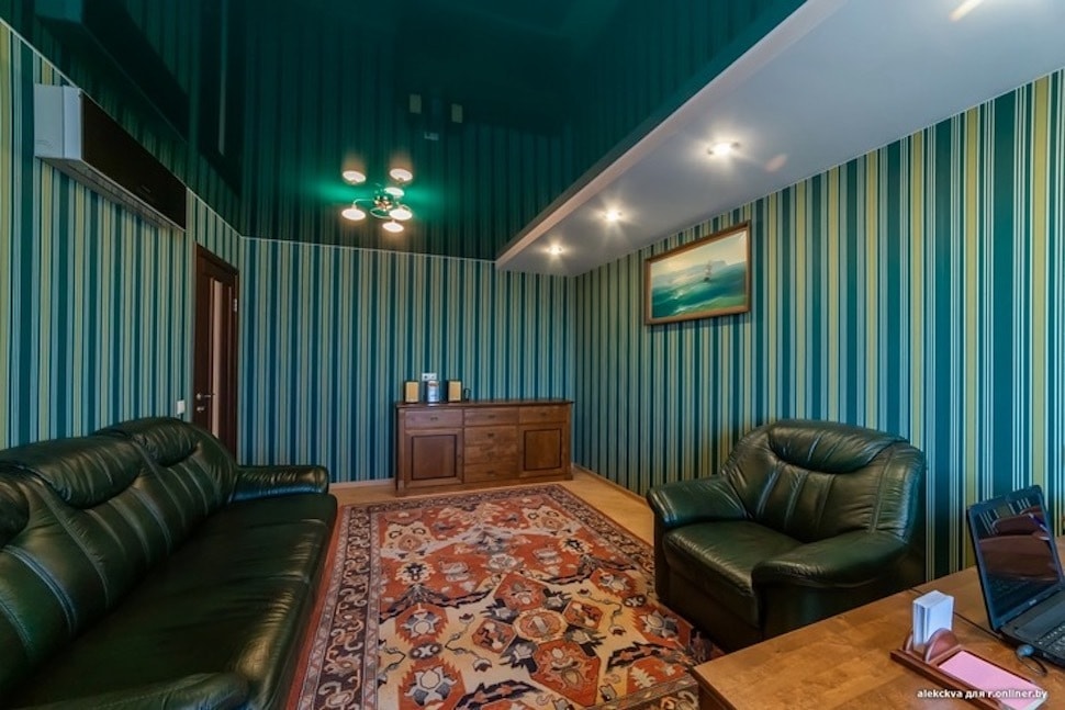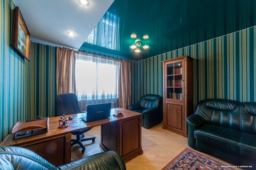 Кабинет опять-таки глубокого зеленого цвета — такого, как в фильмах про частных детективов, работавших в середине прошлого века. (Не берем, конечно, в расчет глянец).