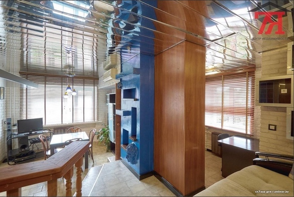 Что касается отделки помещений, то в глаза сразу же бросается зеркальный потолок в гостиной — сайдинг это или еще какой-то материал, понять по фото сложно. Но выглядит уж точно не избито. Синий гипсокартонный короб с вживленным лицом — запоминающаяся деталь.
