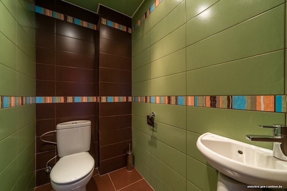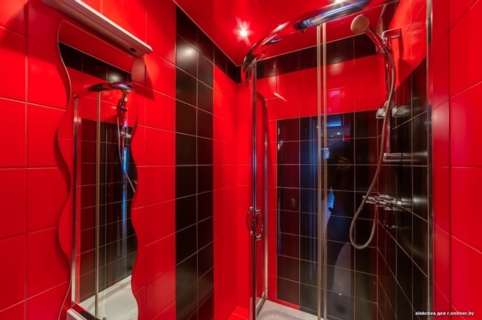 Санузлы выложены плиткой в темных тонах, исключение — красная душевая.