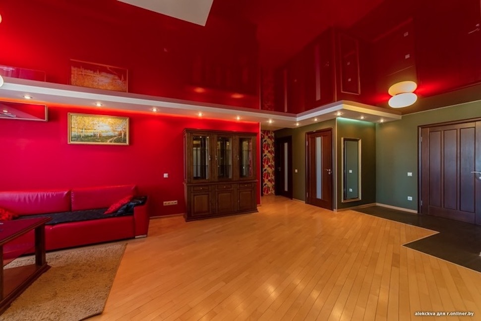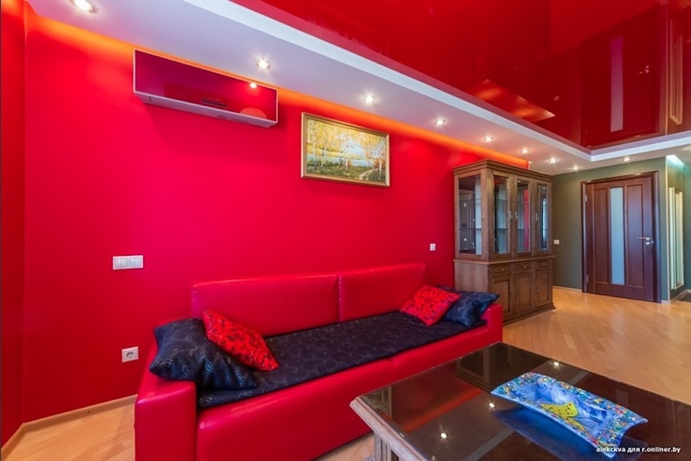 Главное помещение для семейных вечеров — гостиная, совмещенная с кухней. Здесь основную роль играет красный цвет — на стенах и на потолке именно он. Разбавляет «революционность» «барный» зеленый, который также используется в оформлении кухни.