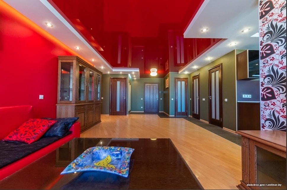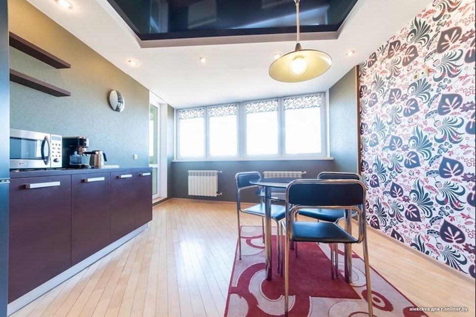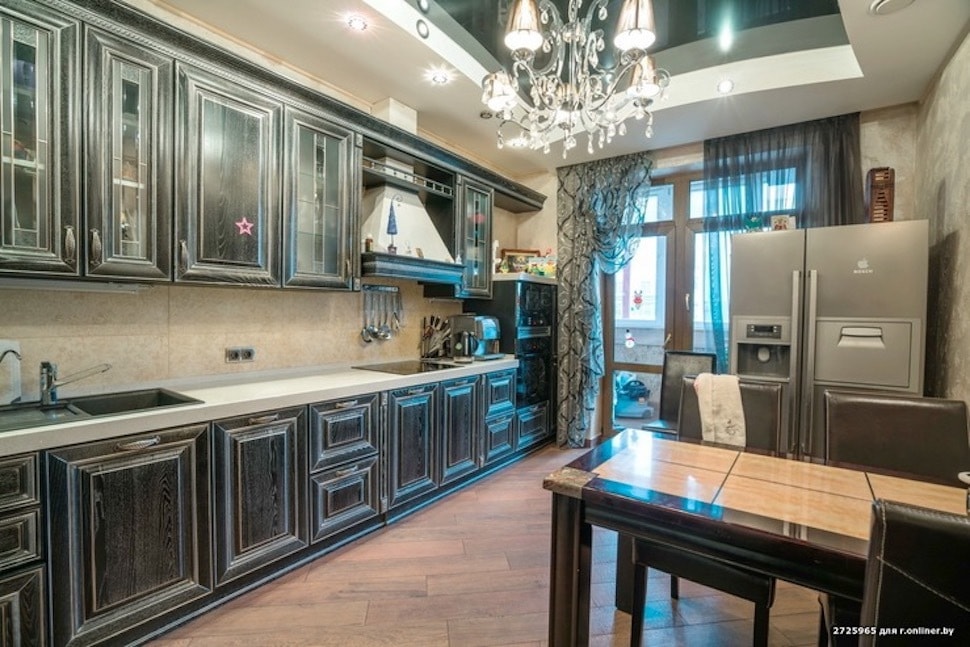 На кухне потолок, кстати, черный глянцевый (в белом гипсокартонном коробе).