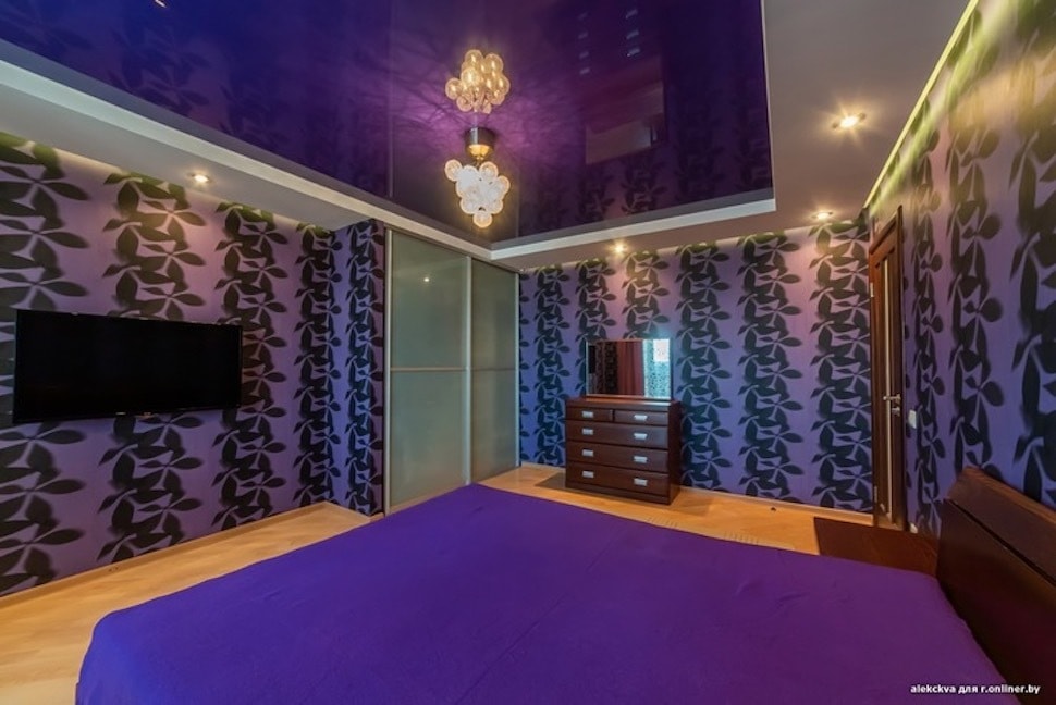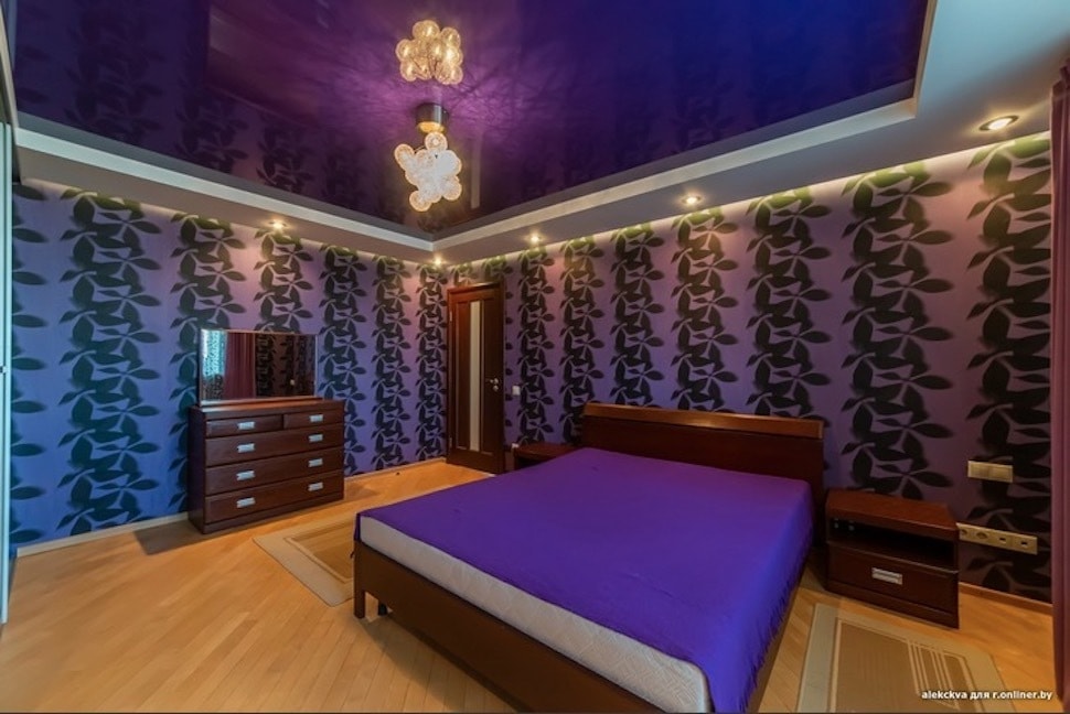 Спальня — фиолетовая, с контрастными обоями.