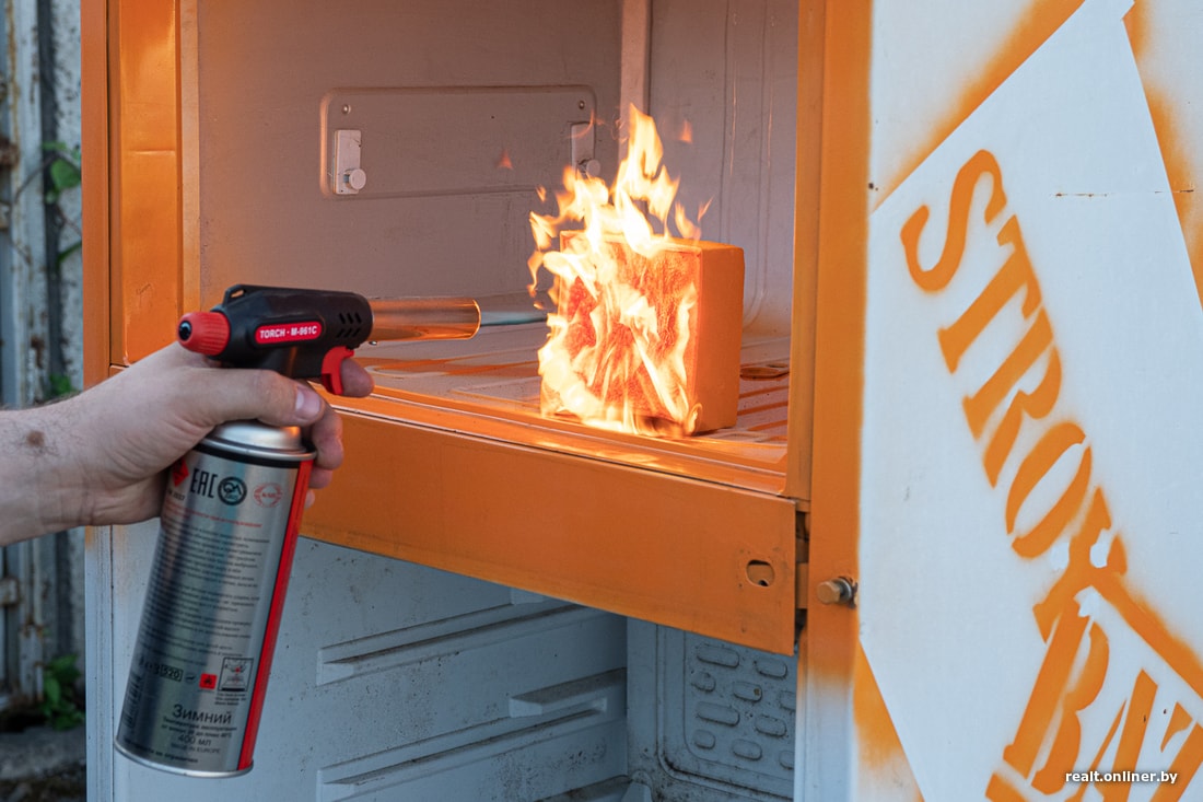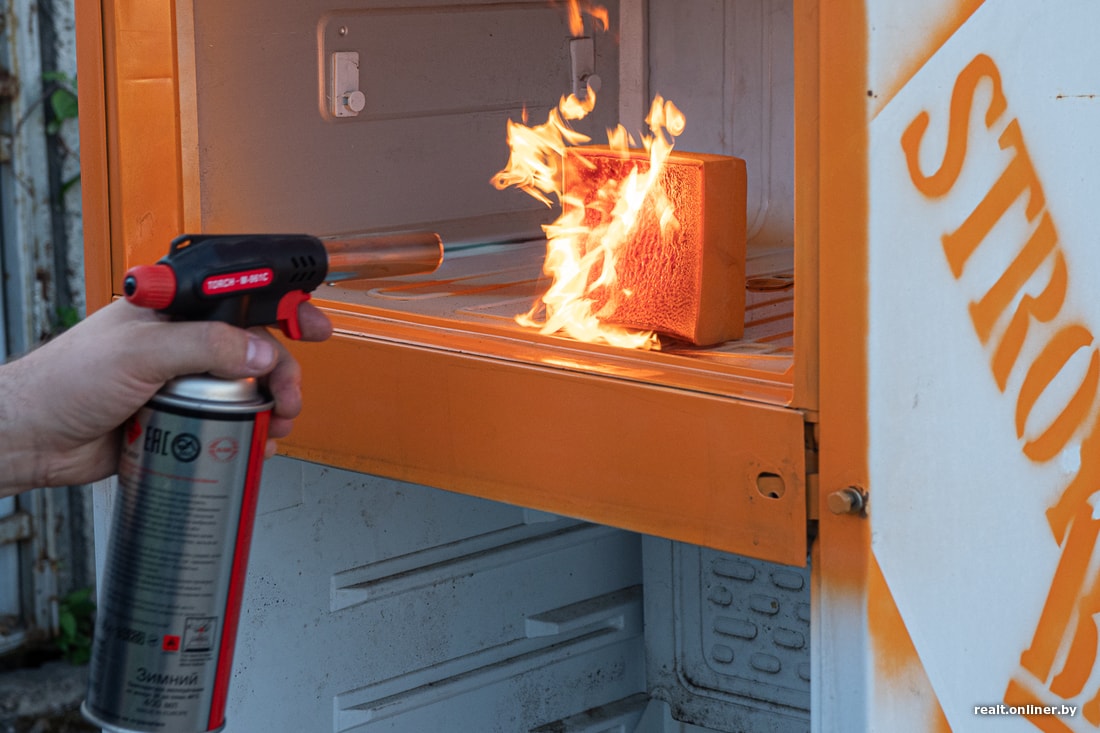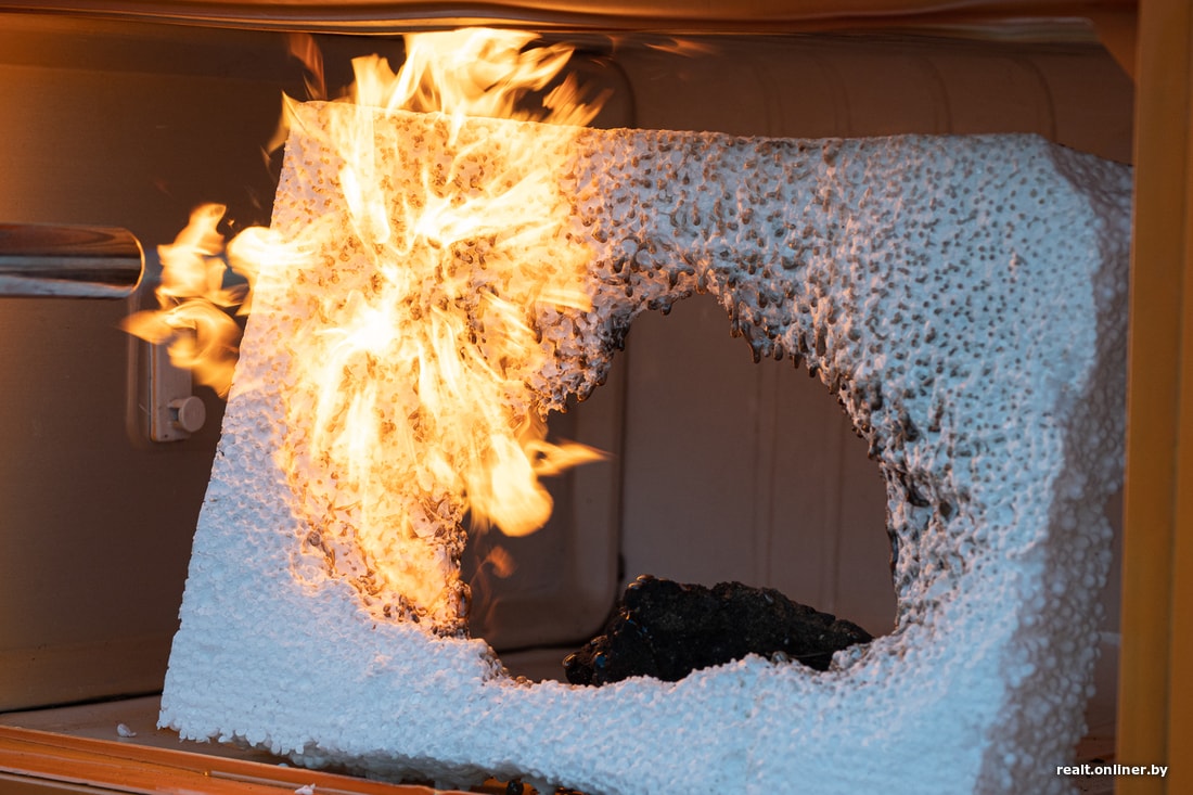 Пенопласт вспыхивает мгновенно и тает так быстро, словно на снег плеснули кипятком. Одновременно идет выброс ядовитых испарений. Но стоит отключить горелку, как огонь на поверхности исчезает. Здесь тоже без сюрпризов. Никто и не обещал, что состоящий на 98% из воздуха хрупкий пенопласт стойко выдержит температуру свыше 1000°C.