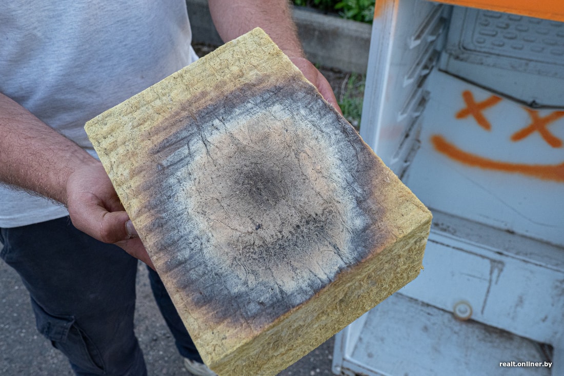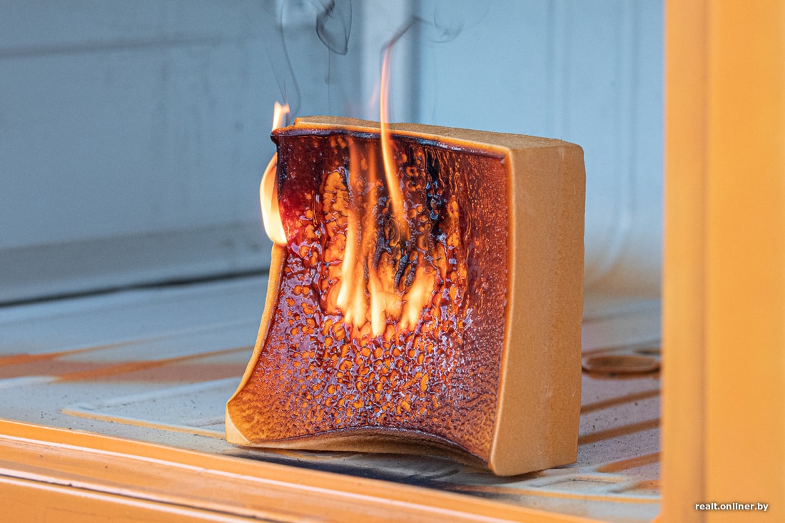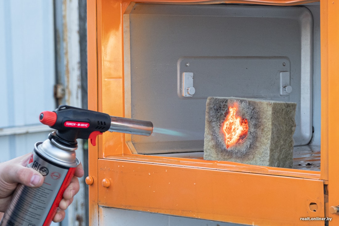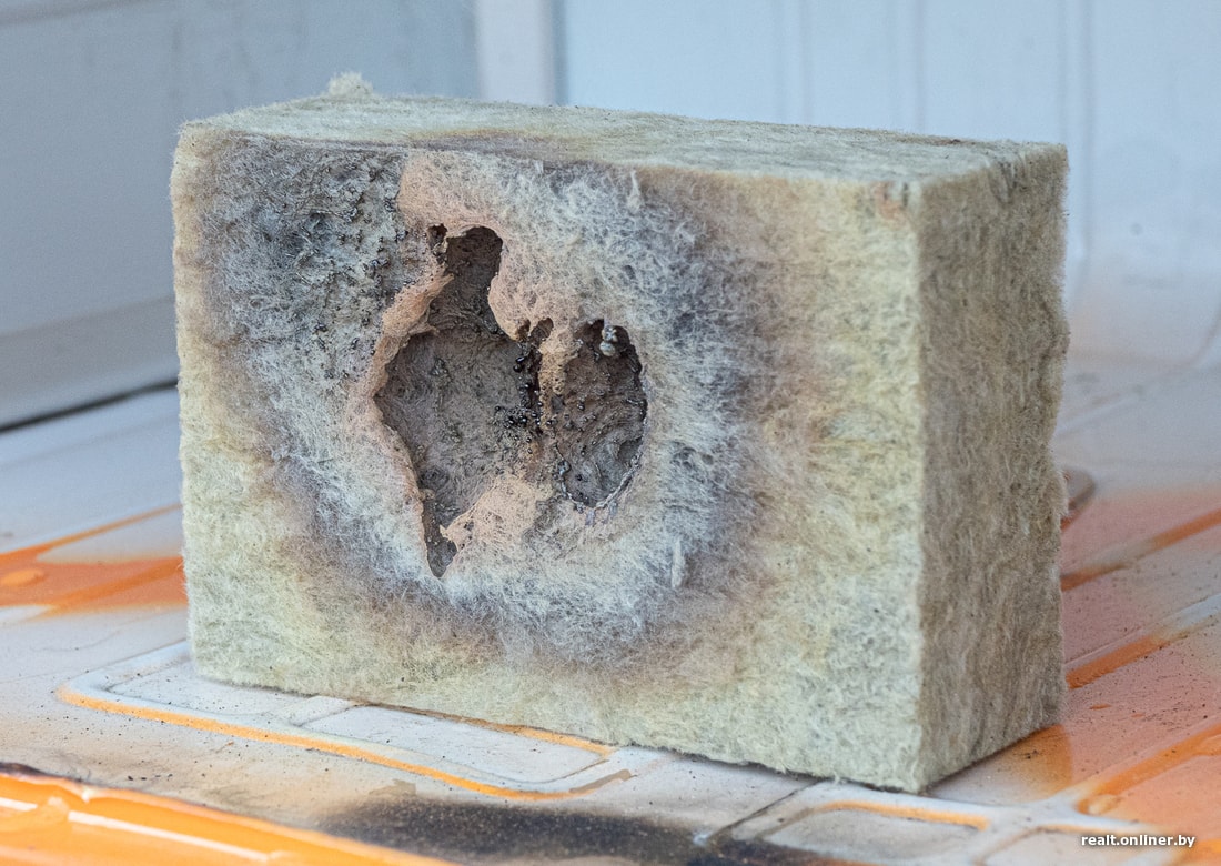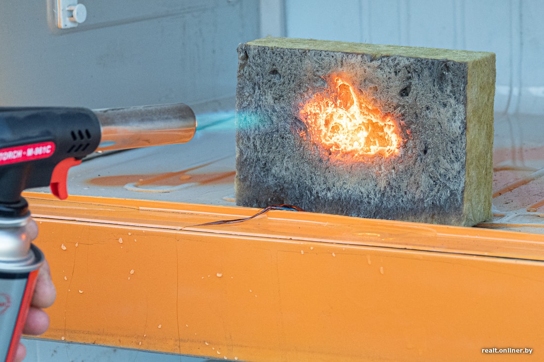 Лучше всего проявил себя образец базальтовой ваты плотностью свыше 100 кг/м³. Спустя полминуты воздействия огня с ним ничего не случилось — поверхность только потемнела.