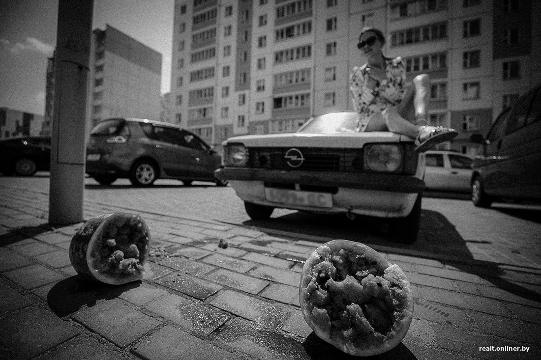 Сделать пластиковый мир еще лучше может только что-то совершенно неестественное. Что-то более неестественное, чем сам пластик. Например, отдых на капоте раритетной иномарки с арбузом в руках. И район вокруг вдруг перестает давить бесконечными городскими проблемами.