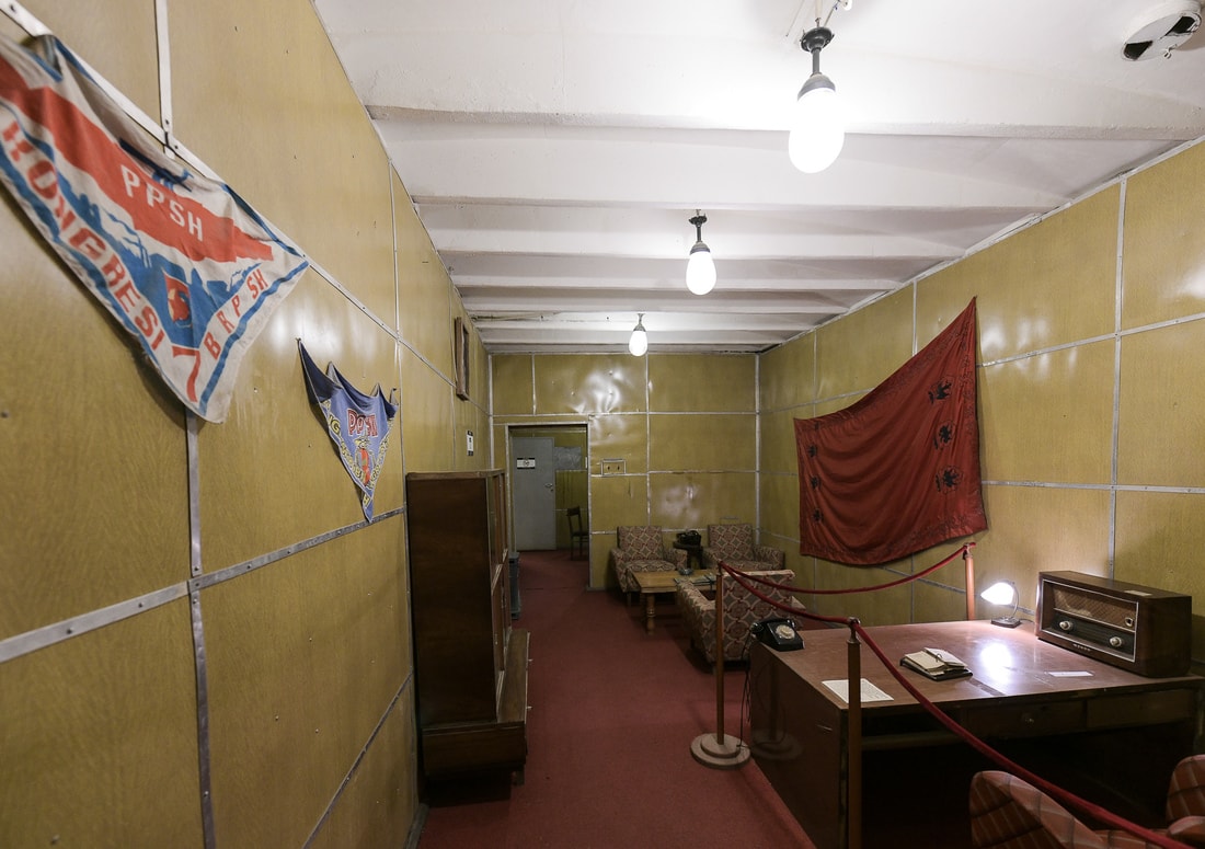 Сам Энвер Ходжа бывал здесь после завершения строительства бункера, но вряд ли ночевал: повода не было. Тем не менее его личные помещения всегда были готовы принять вождя в чрезвычайной ситуации. Приемная для адъютантов, кабинет с переговоркой, спальня и туалет с демонстративно алым унитазом. Вряд ли последний — прижизненный для вождя. Скорее всего, это один из арт-объектов, ведь ныне «Объект 0774» — это еще и выставочная площадка современного искусства. Его официальное название — Bunk’Art 1.