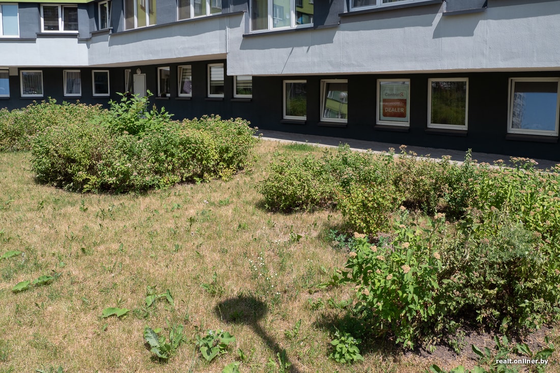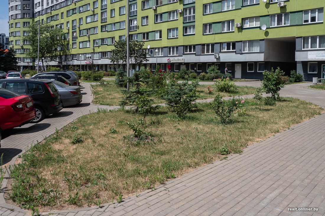 Спустя девять месяцев мы решили вернуться в тот самый двор и посмотреть, как же выглядят клумбы после того, как все расцвело и похорошело. Для сравнения: большинство дворов в «Каскаде» выглядит нейтрально — трава разной степени «выгоревшести» и кусты-цветочки.
