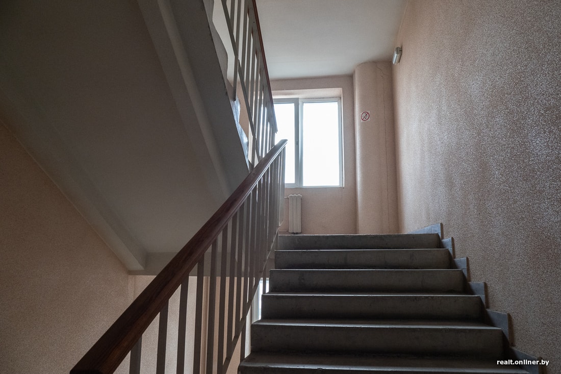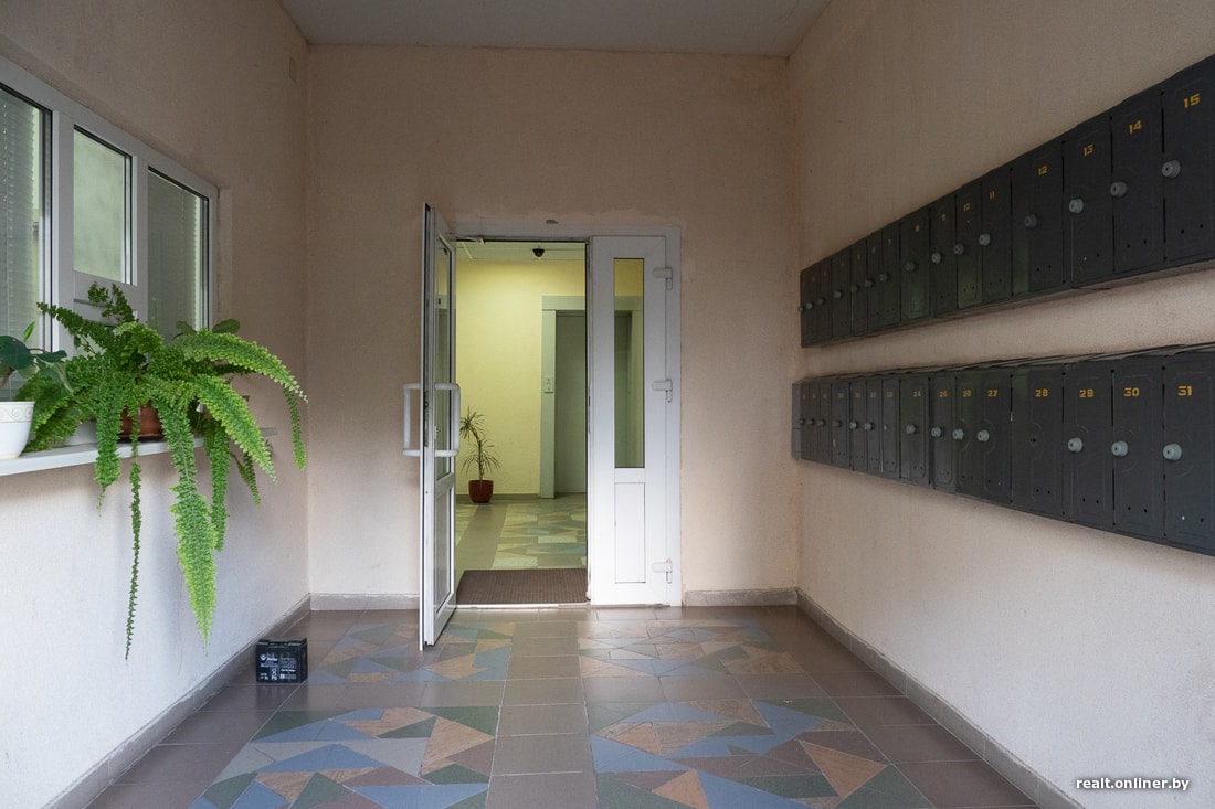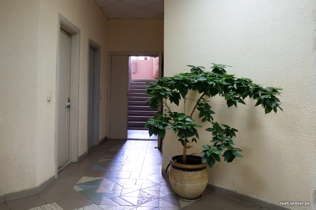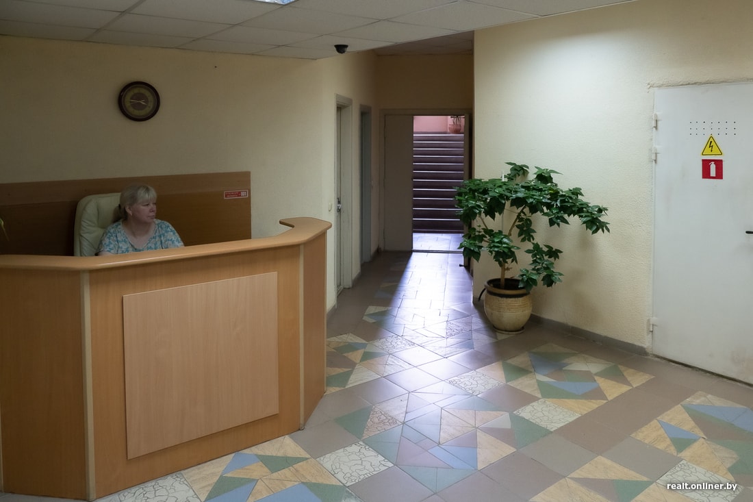 Первый этаж дома отдан под коммерческие помещения, вход в которые организован со стороны улицы. Со второго начинаются квартиры, попасть в которые можно только через огороженную территорию двора и подъезд с консьержем. На каждом этаже дома по четыре квартиры, лифт расположен между ними, а лестница — в отдельном холле с окнами.